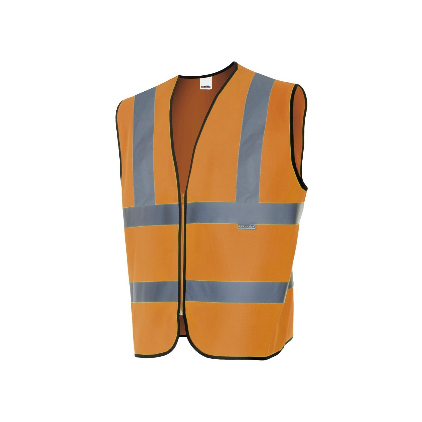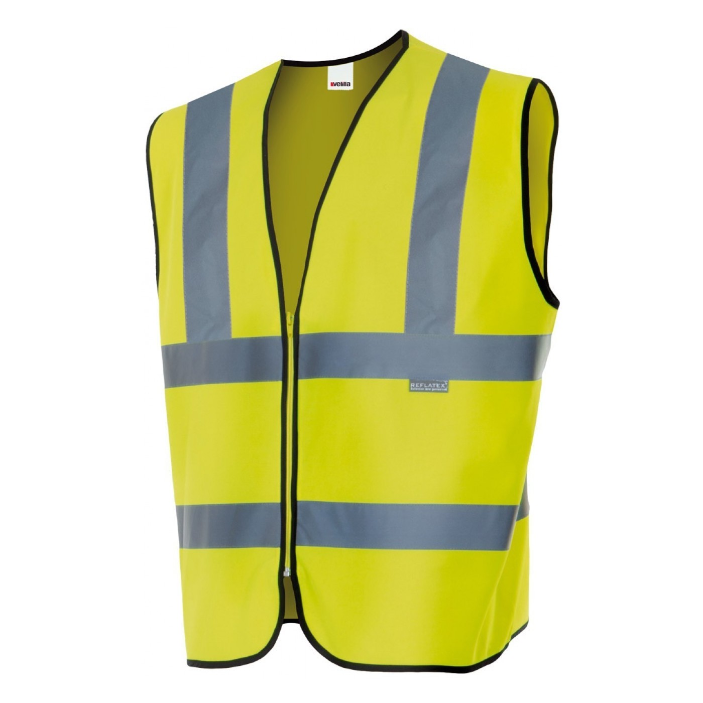 Armilla d'alta visibilitat amb cremallera central i cintes reflectants al front i hombros.