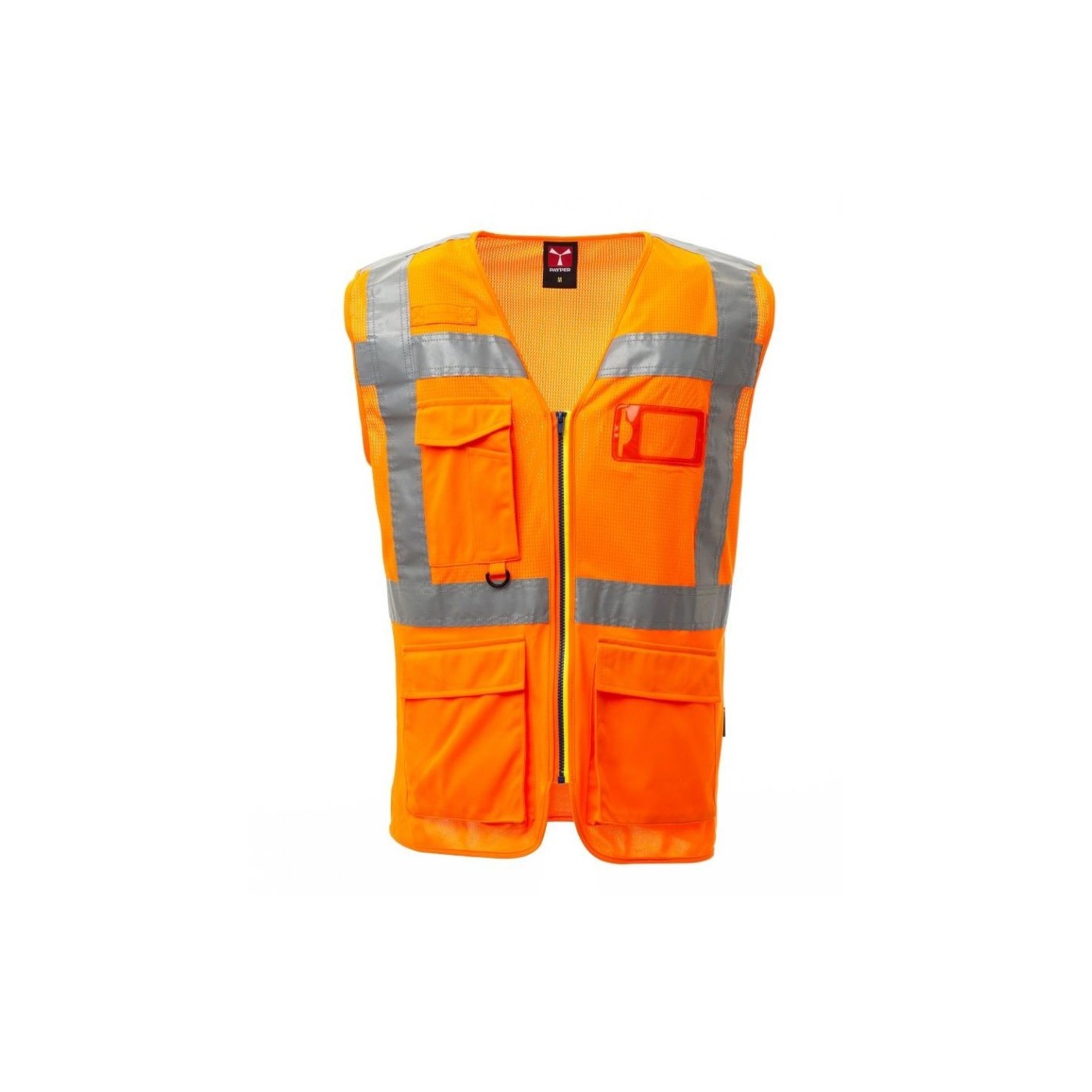 Armilla d'alta visibilitat confeccionada en malla transpirable a la part superior i en teixit Dry-Tech a la part inferior, amb bandes retroreflectants horitzontals a les espatlles, pit i cintura i dues bandes retroreflectants verticals. Tancament amb cremallera SBS, amb cinta bicolor. Suport fix per a targeta didentificació a lalçada del pit esquerre amb la peça posada. Traveta multifunció, una butxaca per a bolígrafs tancat amb velcro i anella al pit dret amb la peça posada. Dues butxaques exteriors amb manxa tancades amb velcro a la part superior i obertura lateral.