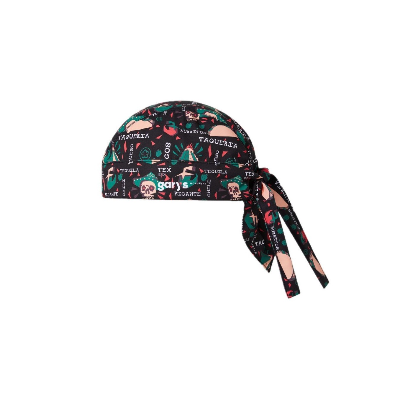 El Gorro pirata de cuina estampat en Microfibra Gary's és lleuger, transpirable i ajustable amb tires posteriors. Compta amb ris absorbent al front, teixit sublimat i estampats vibrants.