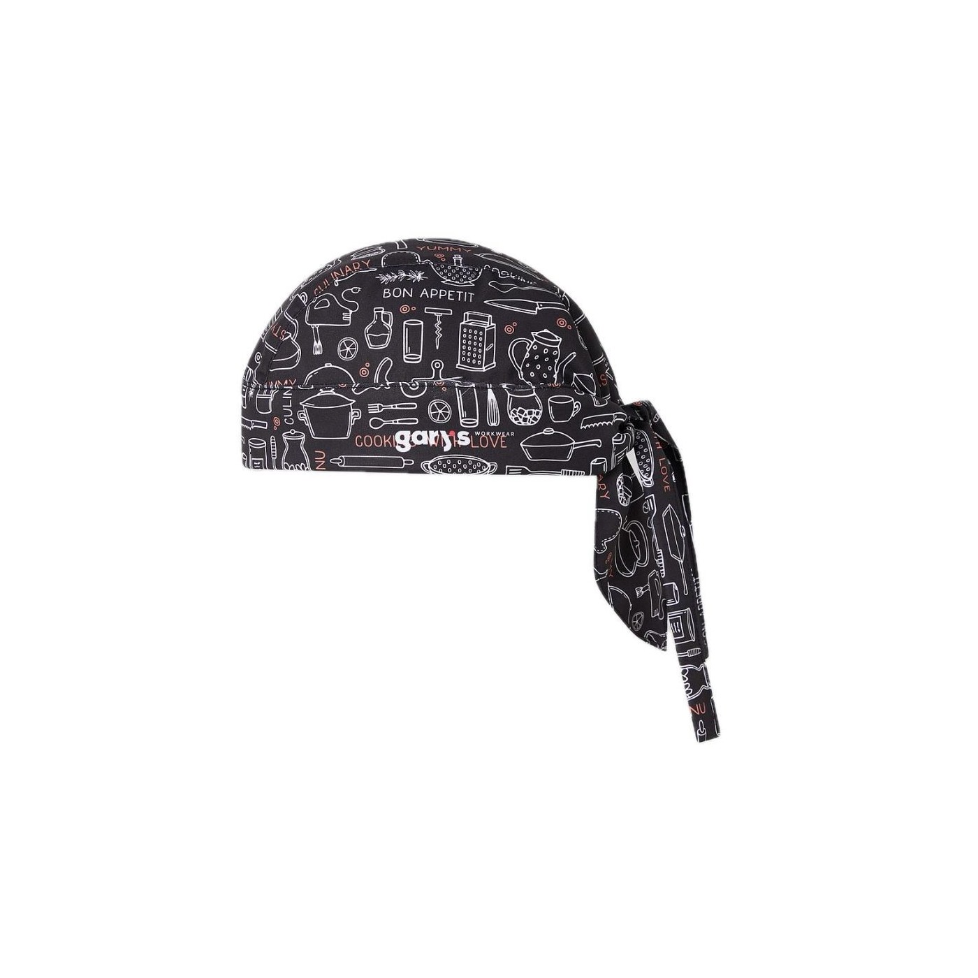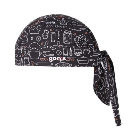 El Gorro pirata de cuina estampat en Microfibra Gary's és lleuger, transpirable i ajustable amb tires posteriors. Compta amb ris absorbent al front, teixit sublimat i estampats vibrants.