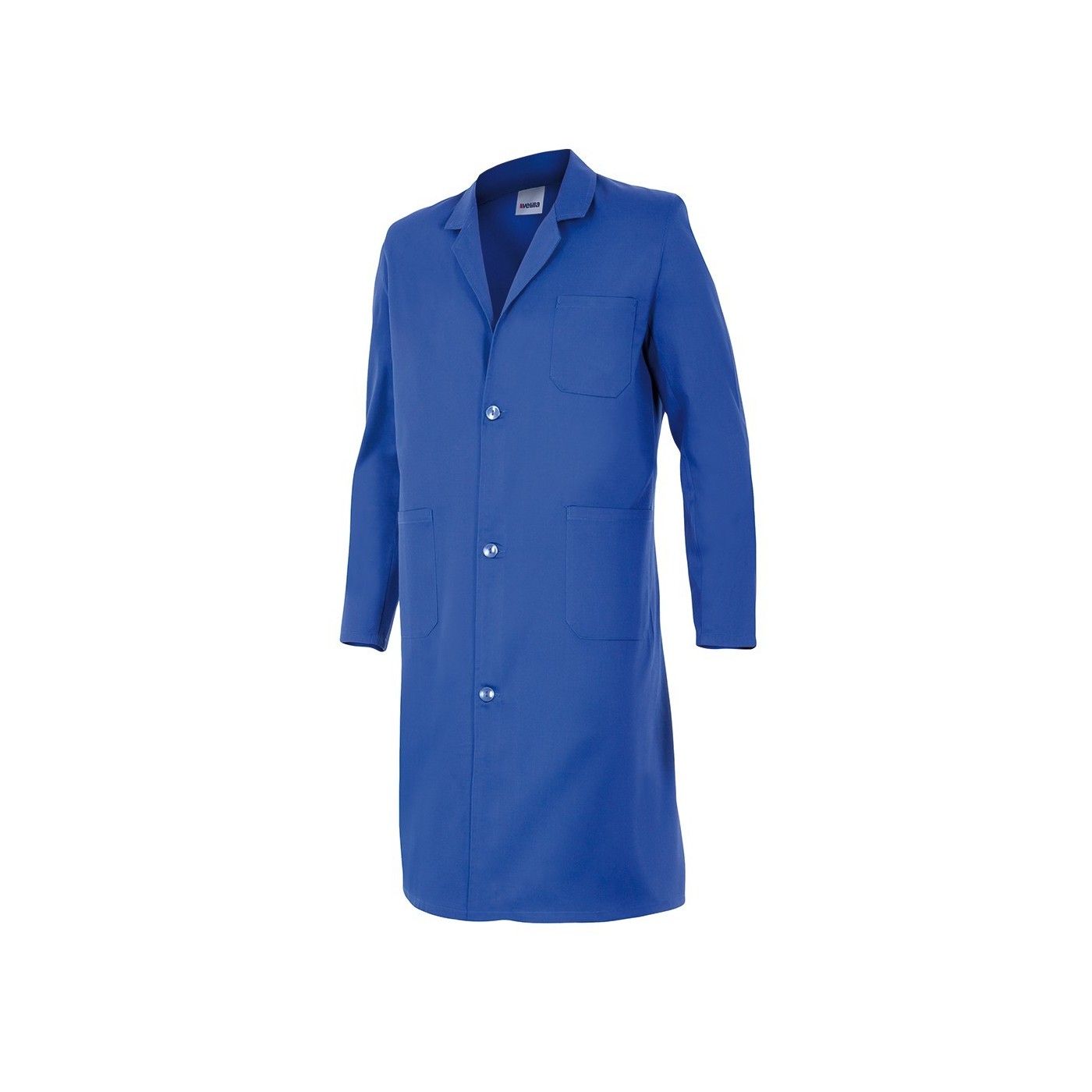 Bata econòmica en diferents col.lors per home amb tres butxaques, tancament central amb botons i cinturó a l'esquena.