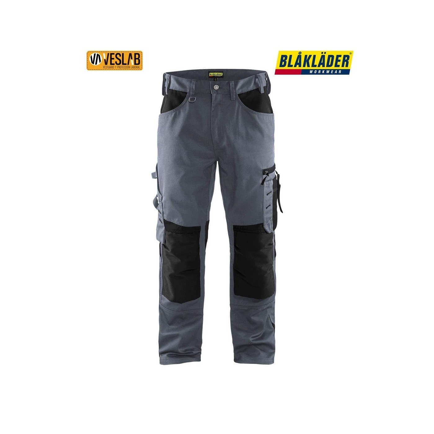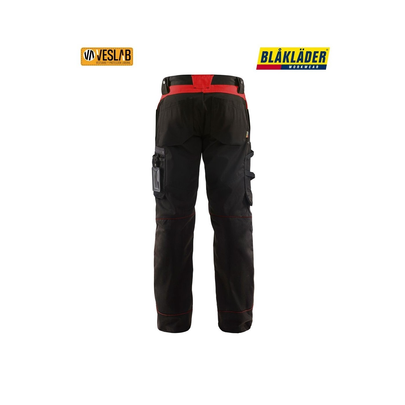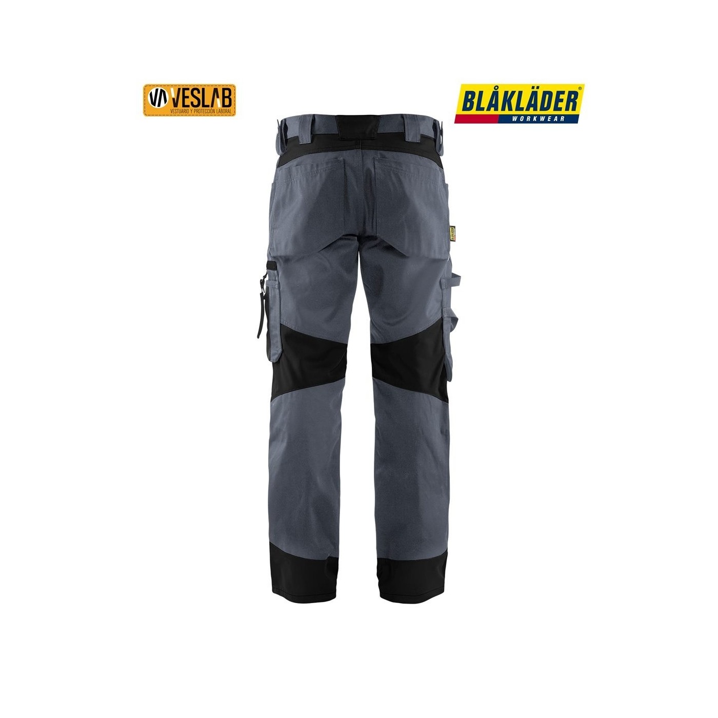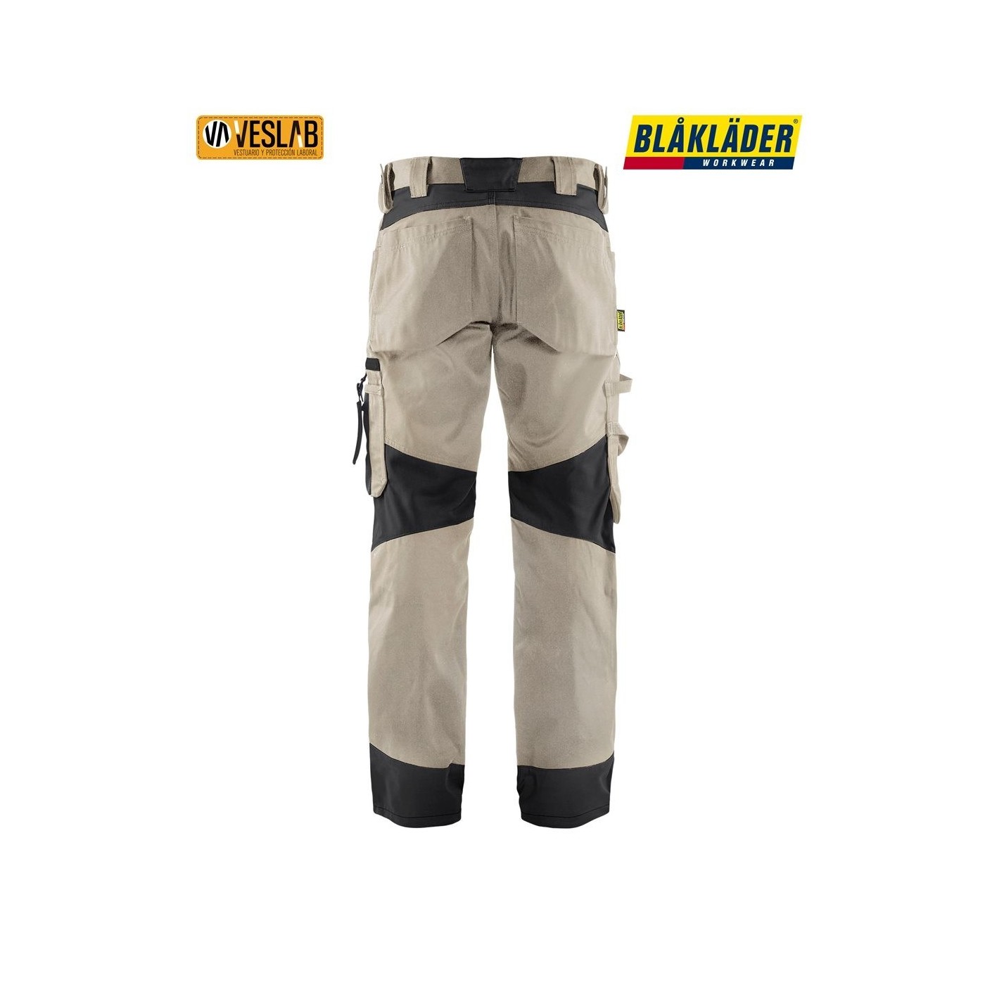 Dues butxaques del darrere amb manxa i corretja per porta martells, així com la butxaca per regla reforçat, butxaca per bolígraf i portafulles. Les cames doblegades prèviament proporcionen un ajust excel·lent.