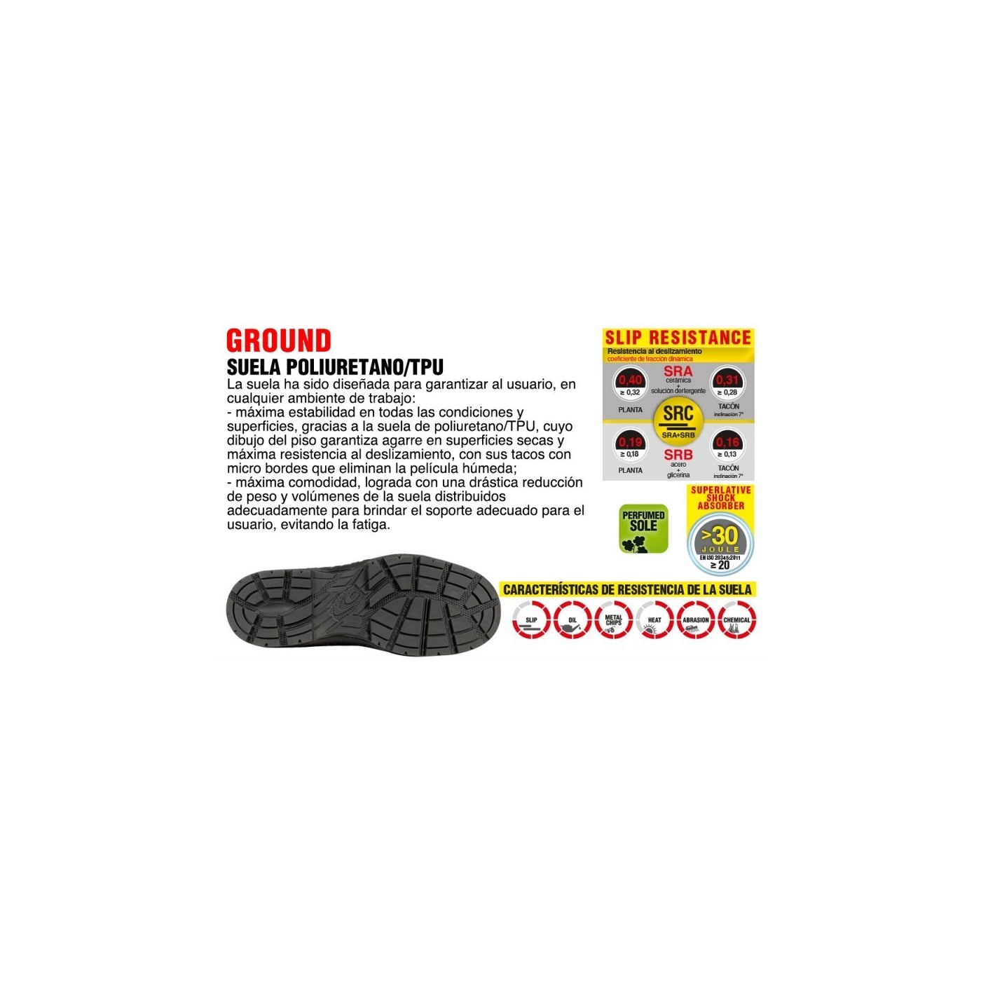 PLANTILLA: EVANIT amb especial barreja d'EVA i nitril, de gran confort i gruix variable (12mm - 8mm - 3,8mm). Termoformada, anatòmica, perforada i folrada amb teixit molt transpirable. Antiestàtica gràcies a un tractament especial de la superfície i als costures realitzades amb fils conductors