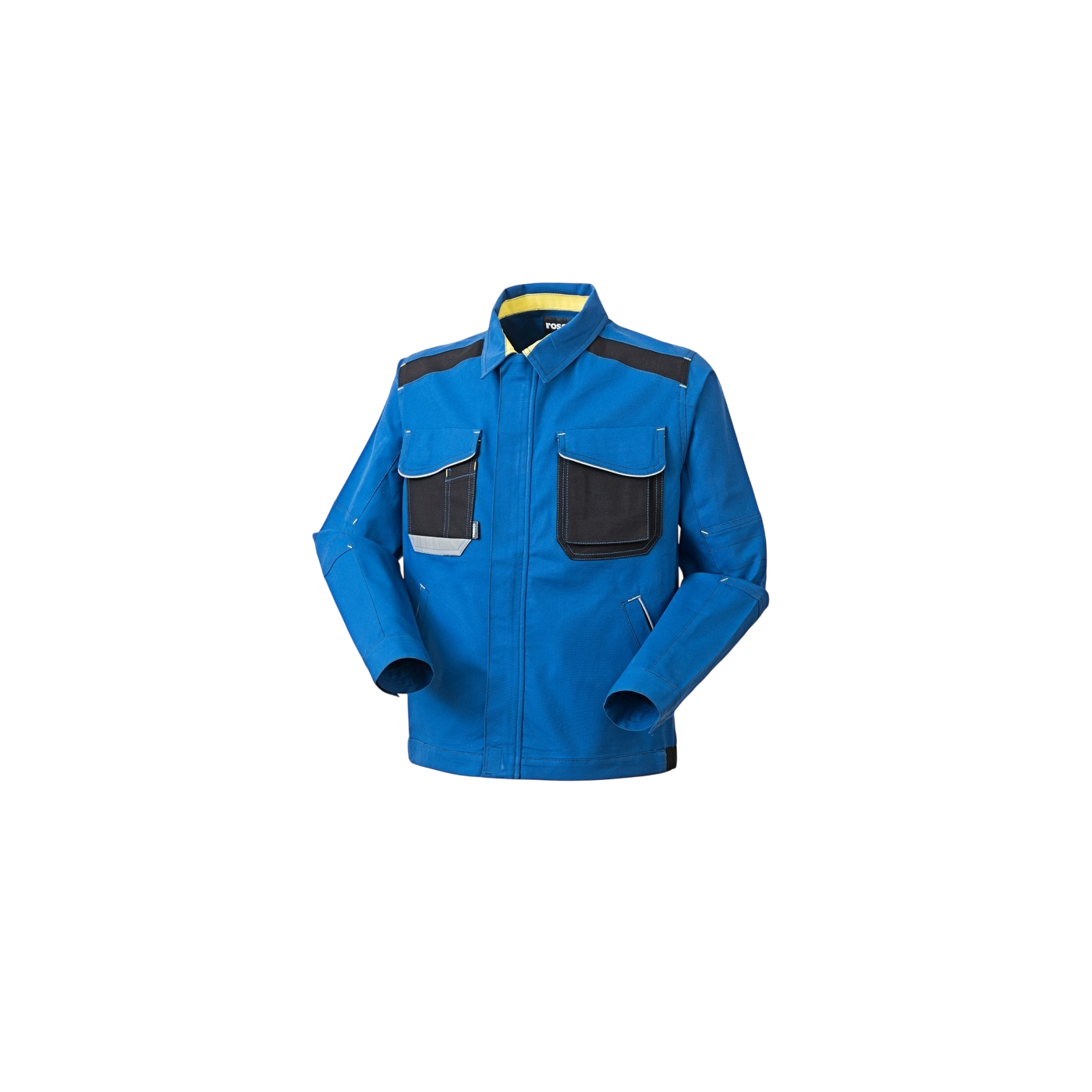 Jaqueta en canvas stretch per a tota la temporada, tancament central amb cremallera coberta amb costura de Velcro i coll de camisa, butxaca al pit amb portabolígrafo tancat amb solapa i inserit de velcro i reflectant, butxaca al pit amb porta-etiquetes desmuntable tancat amb solapa velcro , àmplies butxaques davanteres amb tall oblic, costures reforçades en els colzes, punys a la part inferior ajustables amb velcro, doble elàstic a la cintura, insercions en contrast i bagues.