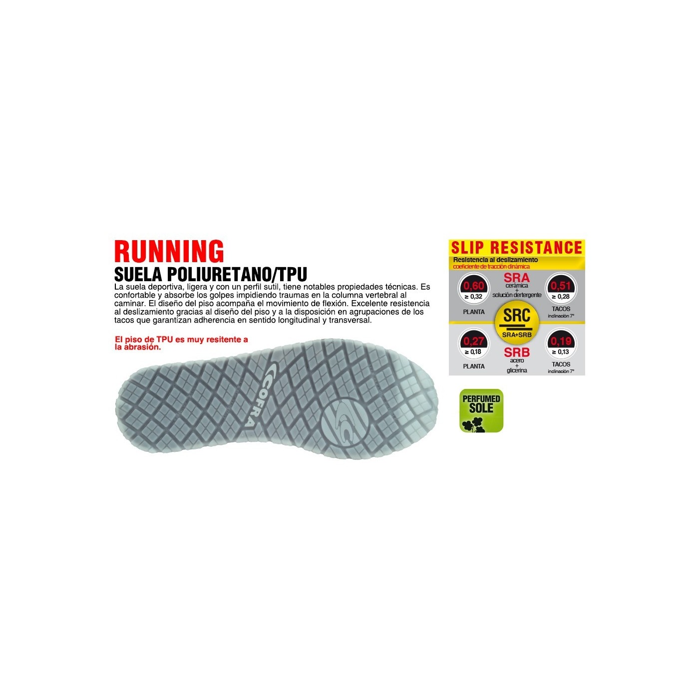PLANTILLA: COFRA SOFT ESD anatòmica, perforada, amb baixa resistència elèctrica, en poliuretà perfumat, suau i confortable; el disseny de l'estrat inferior garanteix absorció de l'energia d'impacte (xoc absorbir) i elevada adherència; l'estrat superior absorbeix la suor i deixa el peu sec