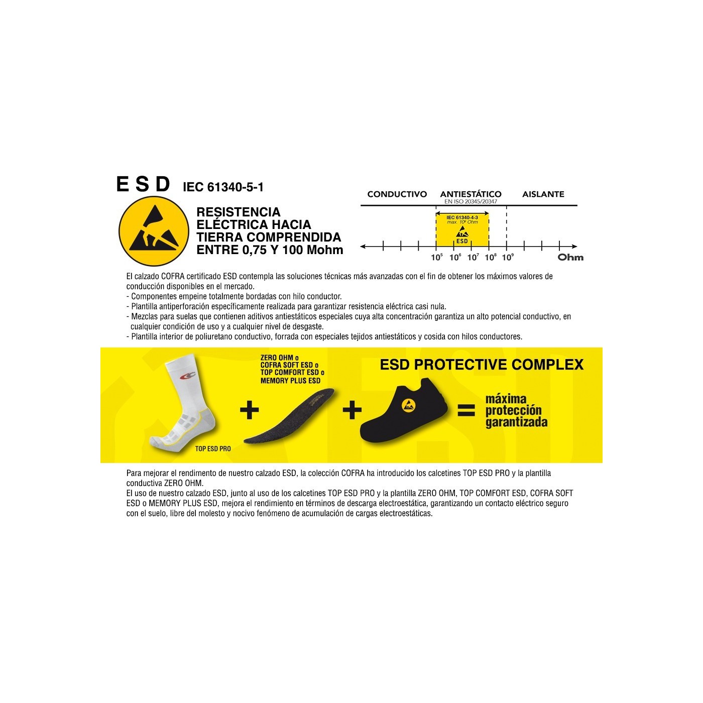 PLANTILLA: FOOT-PAD ESD, extremadament suau i còmoda, amb baixa resistència elèctrica. Gràcies al poliuretà de molt baixa densitat, s'auto modela, permetent una correcta distribució del pes corporal i donant una sensació de confort immediata. L'elevada capacitat d'absorció d'impactes s'aconsegueix amb un material d'alta resiliència i un espessiment perfecte al centre del taló