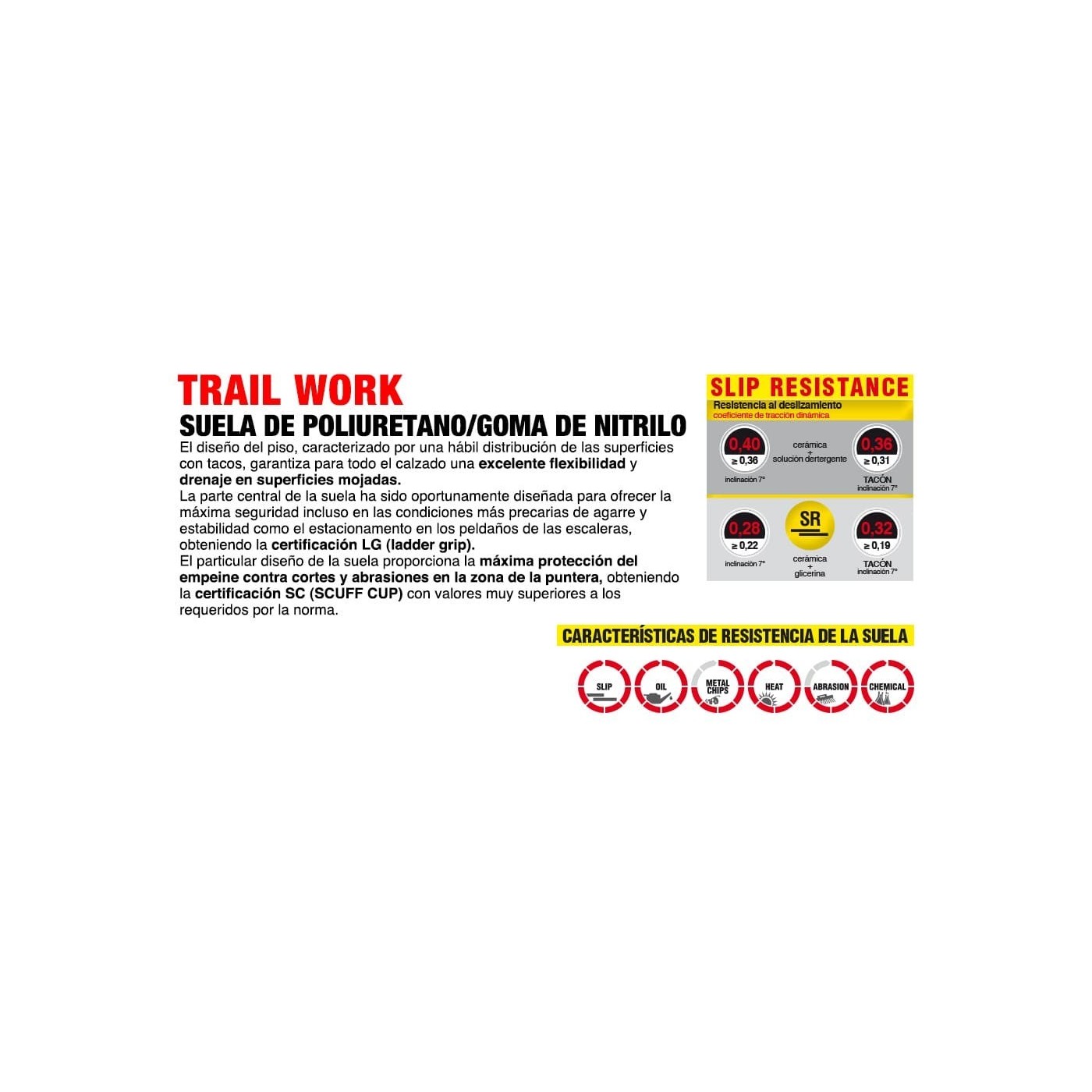 La sola del calçat està feta duna combinació de poliuretà i goma de nitril resistent a altes temperatures. Podeu suportar fins a 300 °C durant un minut de contacte. La puntera és de FIBERGLASS CAP, una fibra de vidre no metàl·lica que ofereix resistència a impactes de fins a 200 J. La plantilla antiperforació és no metàl·lica APT PLUS – Zero Perforation.