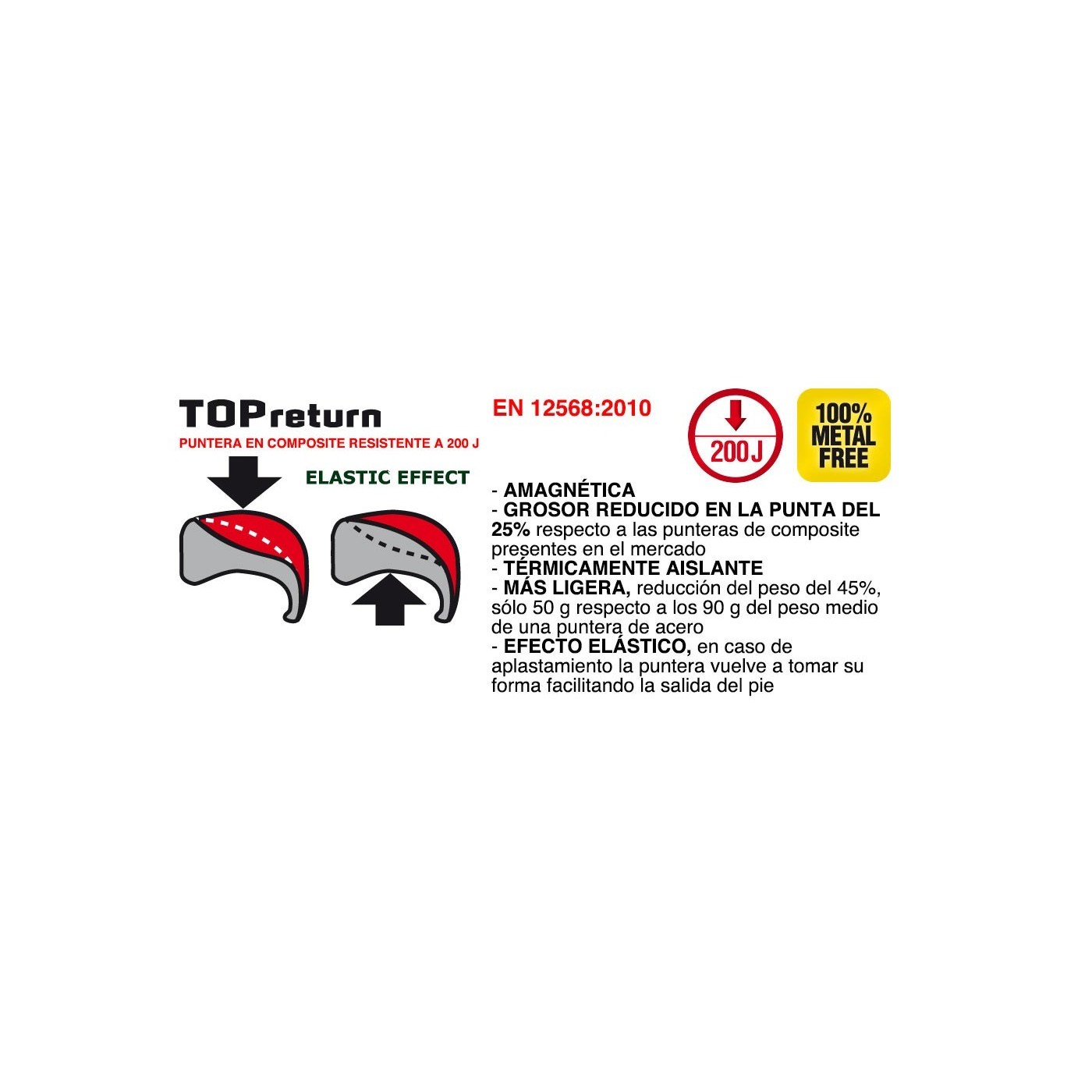PLANTILLA: EVANIT amb especial barreja d'EVA i nitril, de gran confort i gruix variable (12mm - 8mm - 3,8mm). Termoformada, anatòmica, perforada i folrada amb teixit molt transpirable. Antiestàtica gràcies a un tractament especial de la superfície i als costures realitzades amb fils conductors