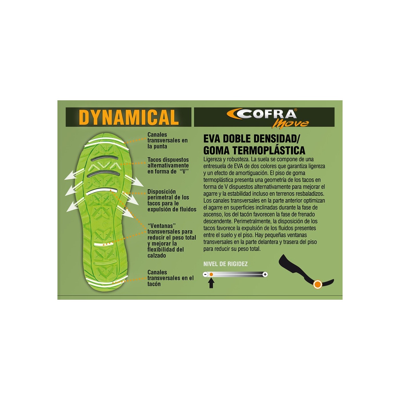 PLANTILLA: COFRA SOFT anatòmica, antiestàtica, perforada, en poliuretà perfumat, suau i confortable; el disseny de l'estrat inferior garanteix absorció de l'energia d'impacte; l'estrat superior absorbeix la suor i deixa el peu sec
