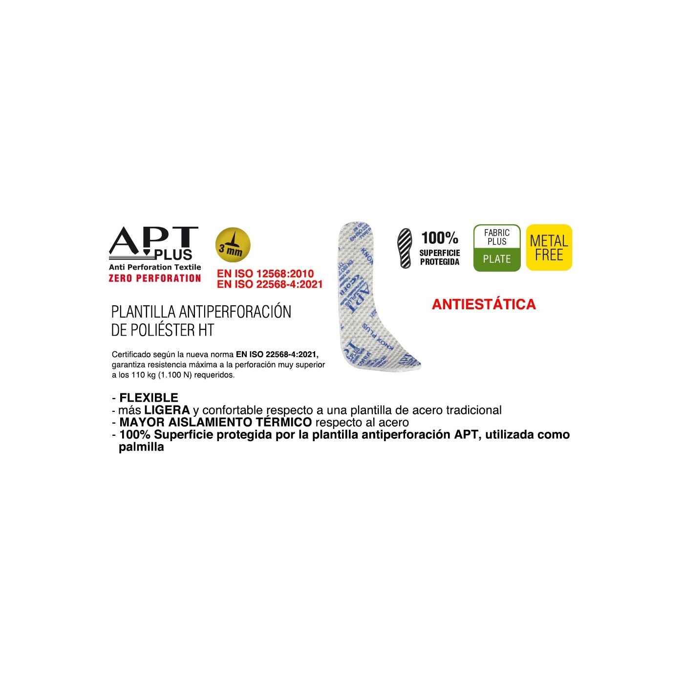 El calçat PIRENEI S7S HI CI SC SR HRO FO LG compta amb una puntera no metàl·lica en fibra de vidre resistent a 200 J, brindant protecció contra impactes. A més, té una plantilla antiperforació no metàl·lica APT PLUS - Zero Perforation, que protegeix els peus d'objectes esmolats i punxants. La forma és de talla 11 Mondopoint, assegurant un ajustament còmode.