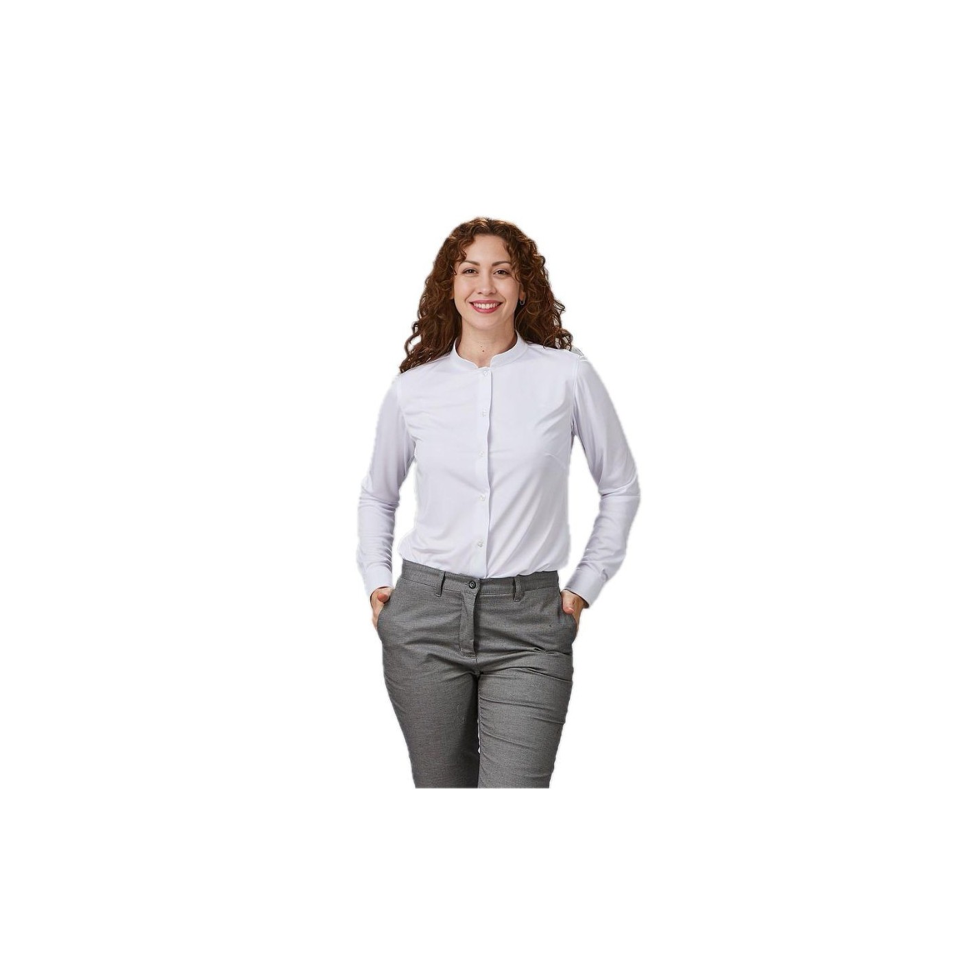Camisa de dona coll mao slim fit, fabricada amb innovador teixit elàstic CROSS ELASTIK Interlock, amb propietats hidròfugues, transpirables i d’ajust 360º. Disseny elegant i funcional, ideal per a comerç i hostaleria.