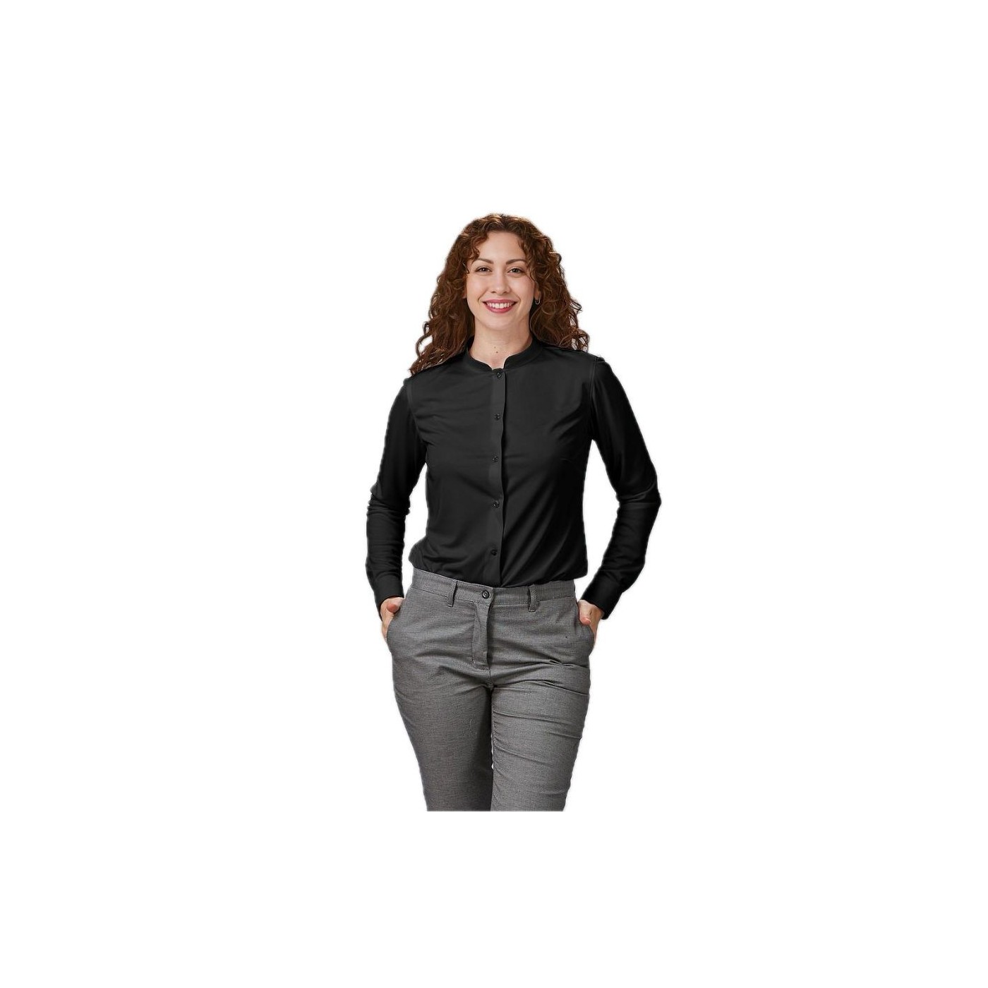 Camisa de dona coll mao slim fit, fabricada amb innovador teixit elàstic CROSS ELASTIK Interlock, amb propietats hidròfugues, transpirables i d’ajust 360º. Disseny elegant i funcional, ideal per a comerç i hostaleria.