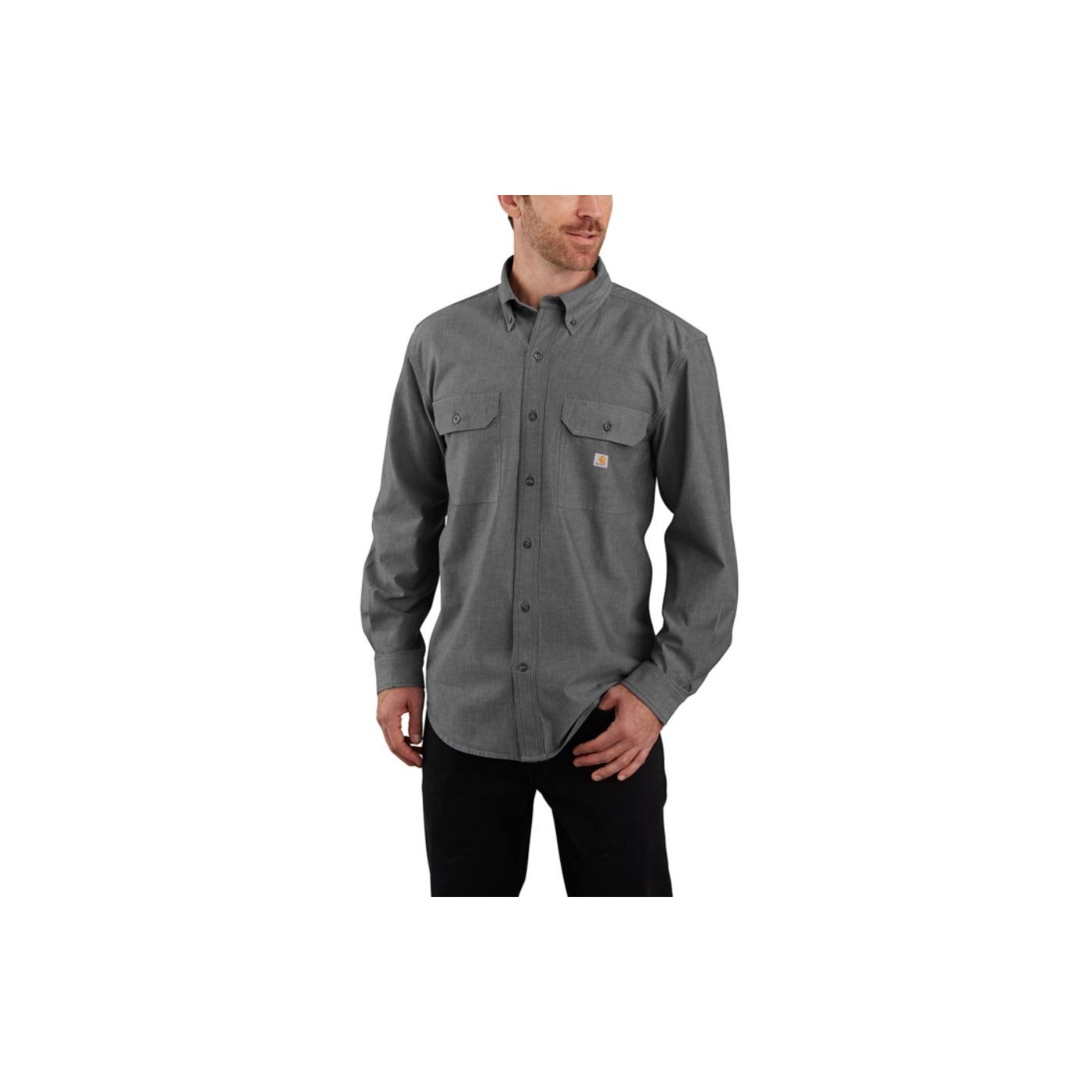 Camisa de treball de màniga llarga Carhartt amb tall Loose Fit, fabricada en chambray 100% cotó lleuger i transpirable. Inclou butxaques amb solapa, punys ajustables i plecs a les espatlles. Ideal per a un look professional i còmode.