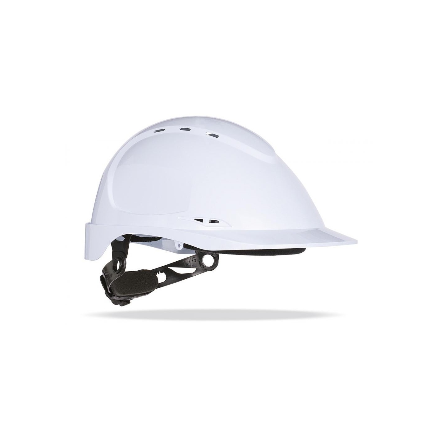 Es tracta d'un Casc de protecció per a la indústria ventilat en color blanc, tancament ruleta, arnès tèxtil 6 punts.