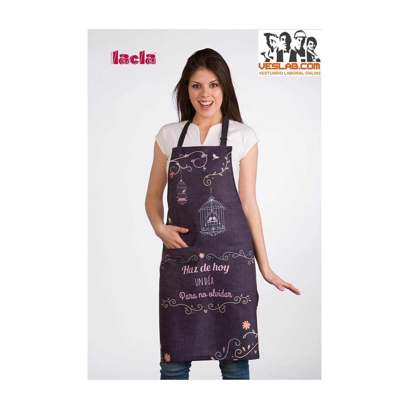 Delantal estampado mediano con peto envolvente y bolsillo . tira cuello graduable con hebilla . Se ajusta con cintas que se anudan por la espalda.