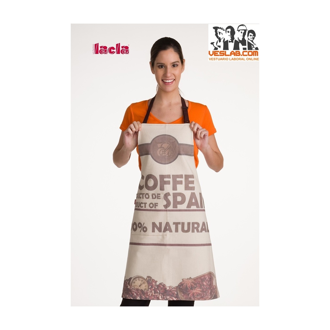 Davantal estampat mitjà amb peto envoltant i butxaca. tira coll graduable amb sivella. S'ajusta amb cintes que es nuen per l'esquena.