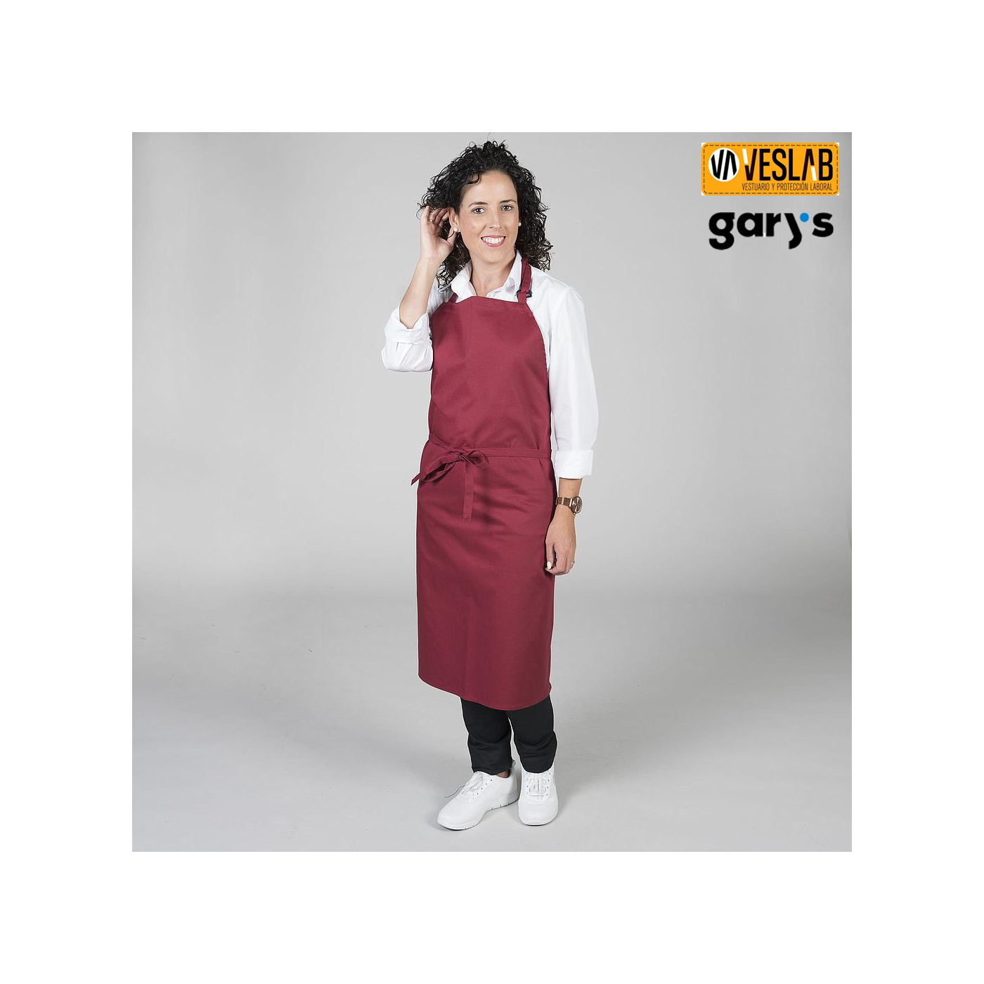 Davantal sense butxaques, amb peto i sivella reguladora al coll per ajustar. Cintes per nuar del mateix teixit. Model ideal per a uniformes de cuina i restauració, cambrer, càtering i comerç en general.