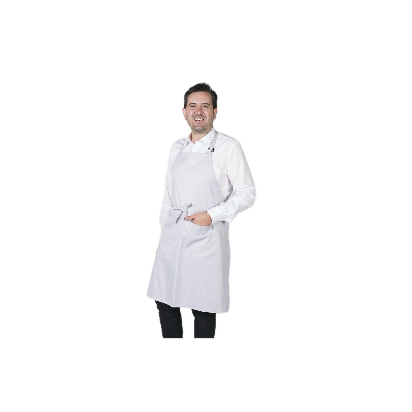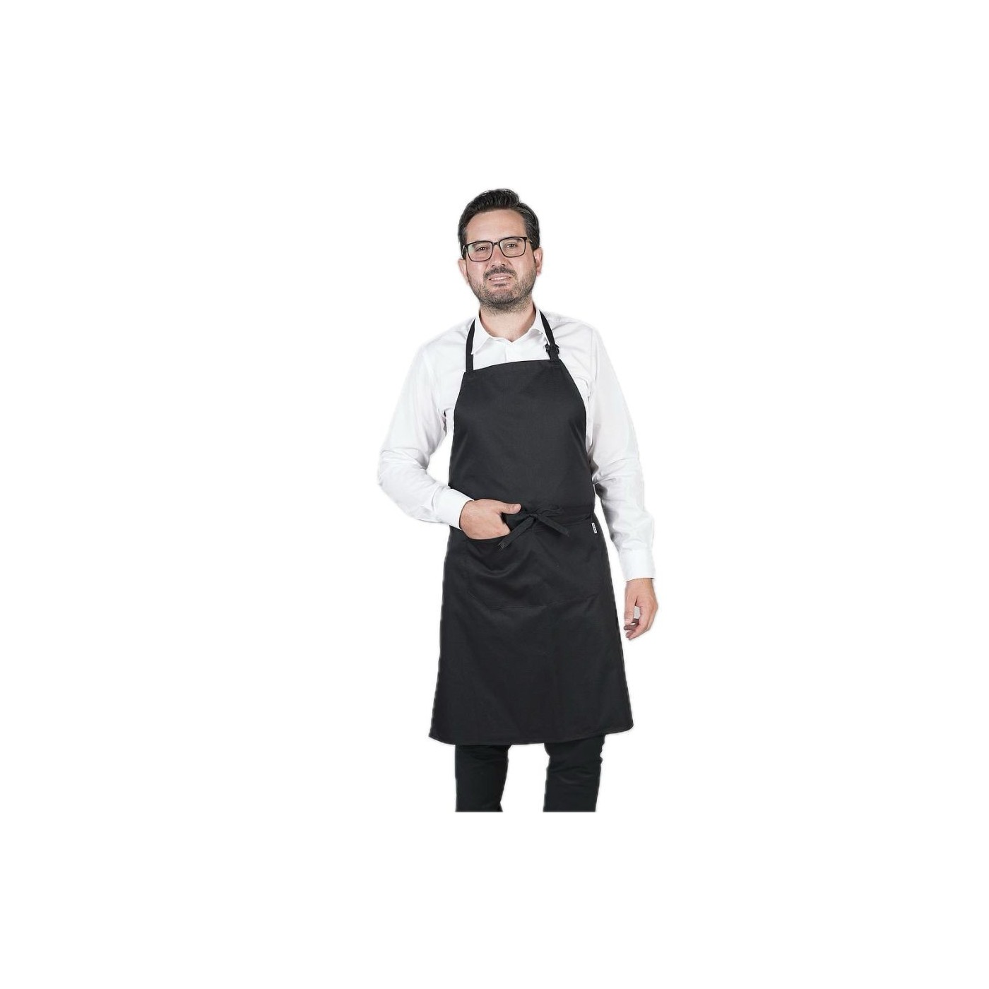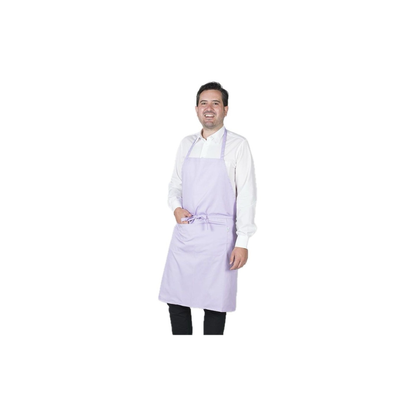 Davantal de peto amb una butxaca davantera i sivella reguladora al coll per ajustar. Cintes per nuar del mateix teixit. Model ideal per a uniformes de cuina i restauració, cambrer, càtering i comerç en general.