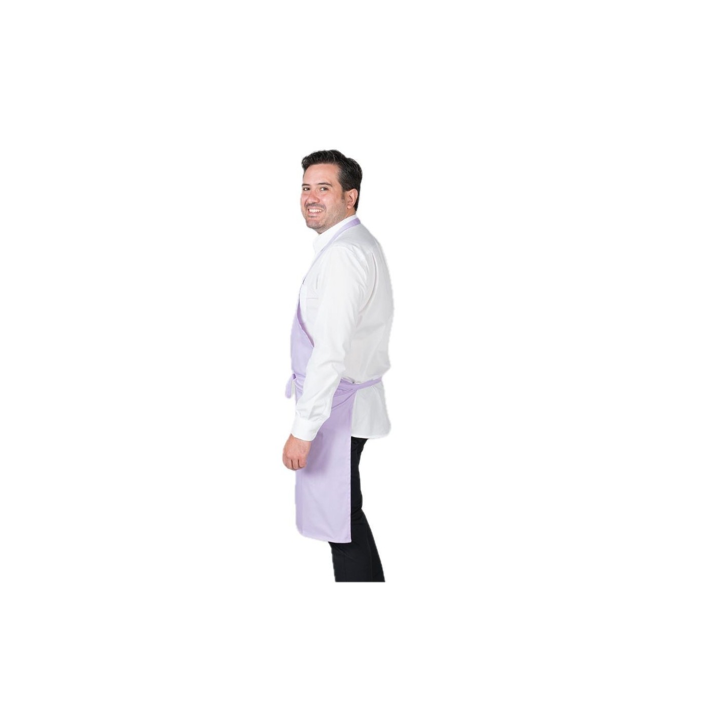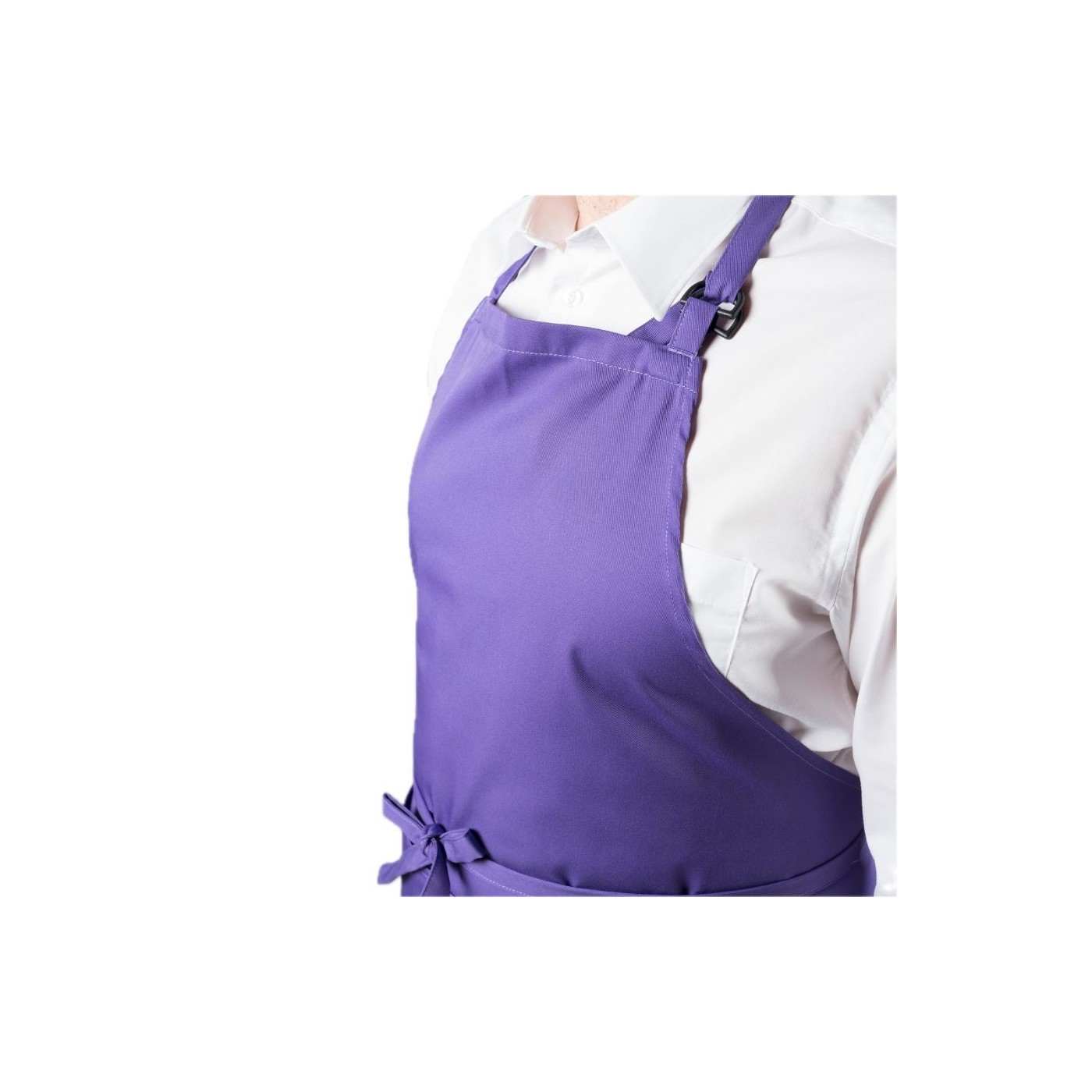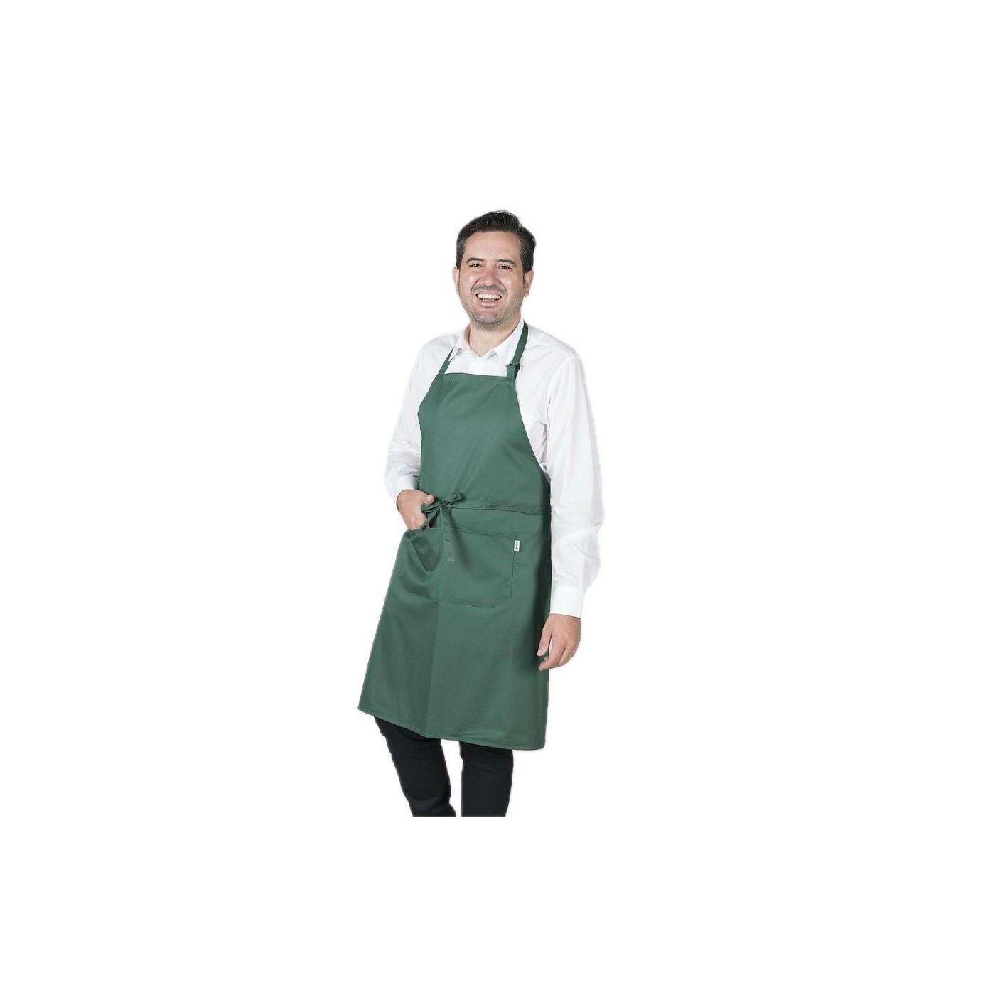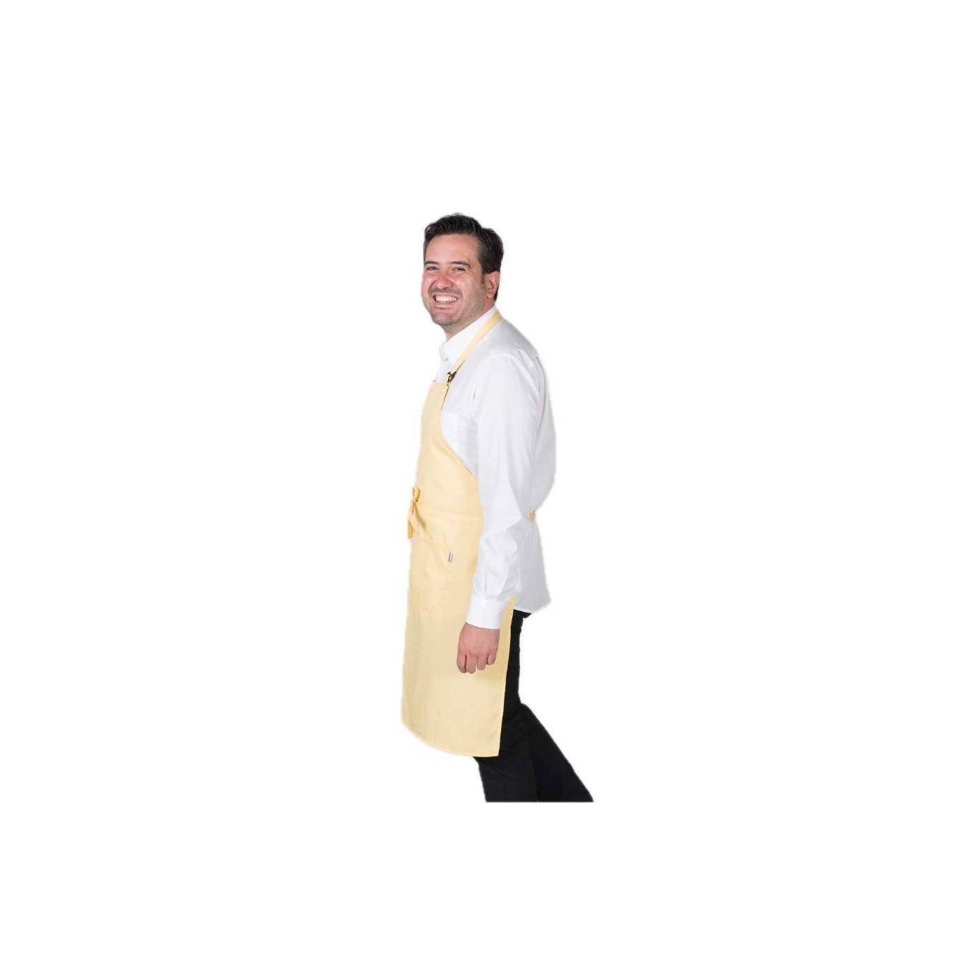 Davantal de peto amb una butxaca davantera i sivella reguladora al coll per ajustar. Cintes per nuar del mateix teixit. Model ideal per a uniformes de cuina i restauració, cambrer, càtering i comerç en general.