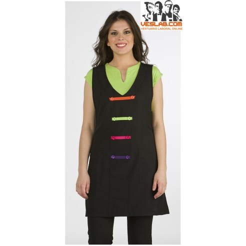 Estola coll en punta, davant amb costadillos i butxaques, peça central amb travetes de colors amb botons, esquena amb pinces, cises rivetejades amb viu, ajust cintura amb cintes que es creuen per l'esquena i es nuen a la cintura.