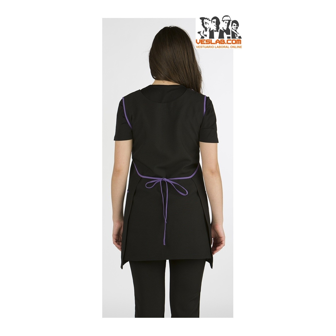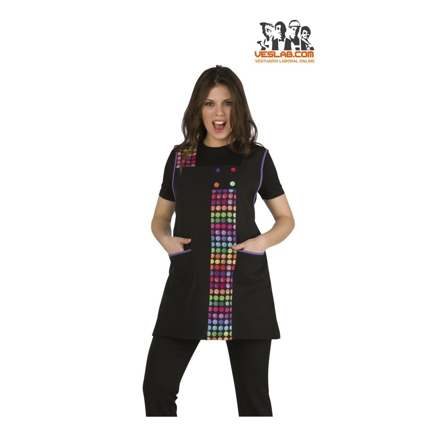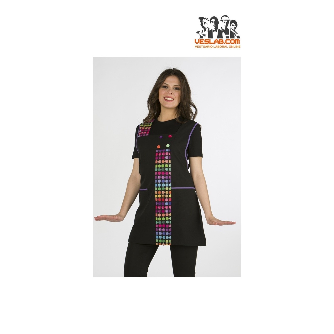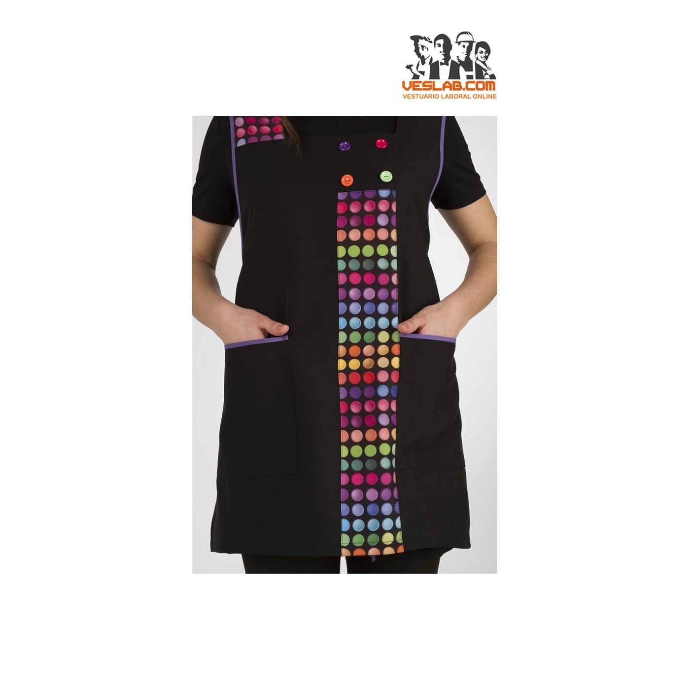 Estola escot quadrat, davanter amb peça estampada amb botons de colors, viu de color a les cises i butxaques, 1 tirant estampat, ajust cintura amb cintes de color que es creuen per l'esquena i es nuen a la cintura.