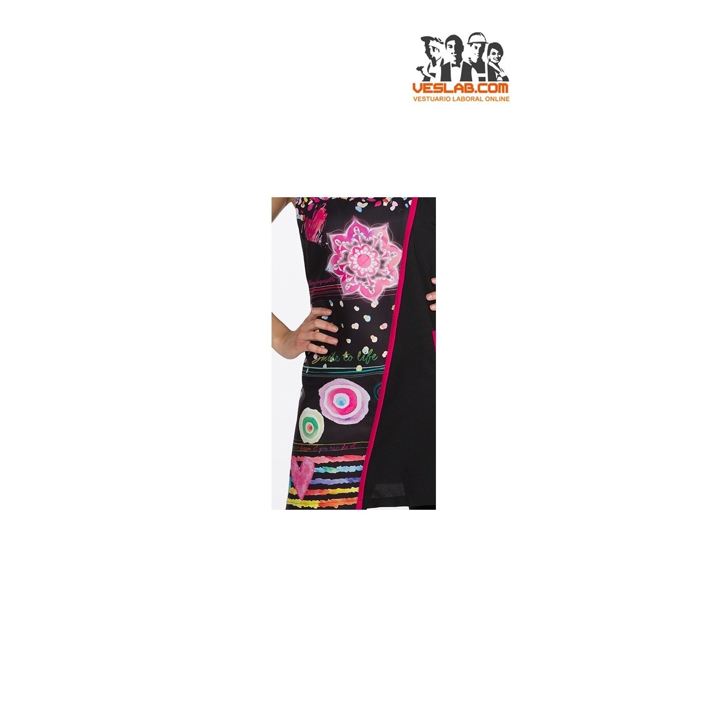 Estola escot quadrat, 1 davanter en diagonal estampat, viu de color en costura, doble butxaca de color, tirants bicolor, ajust cintura amb cintes de color que es creuen per l'esquena i es nuen a la cintura.