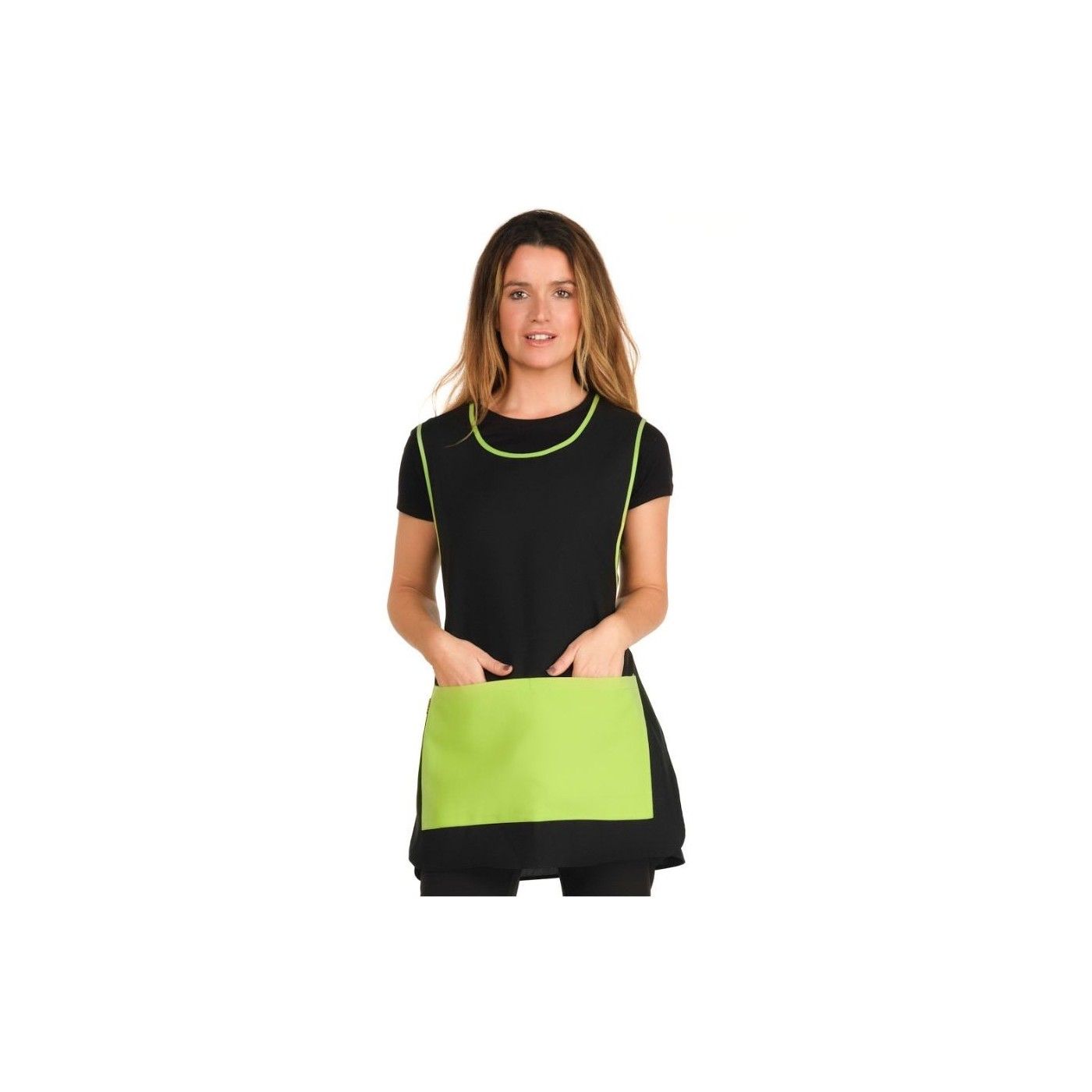 Estola ajustada, amb escot rodó i cises polides amb viu de color, davant llis amb butxaca central divisori de color, baixos rodons, ajust cintura amb cintes que es creuen per l'esquena i es nuen a la cintura.