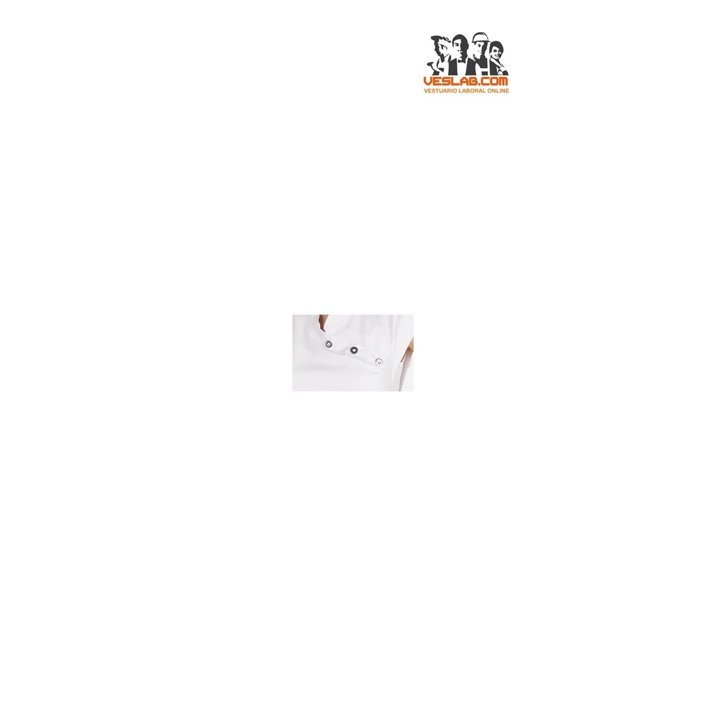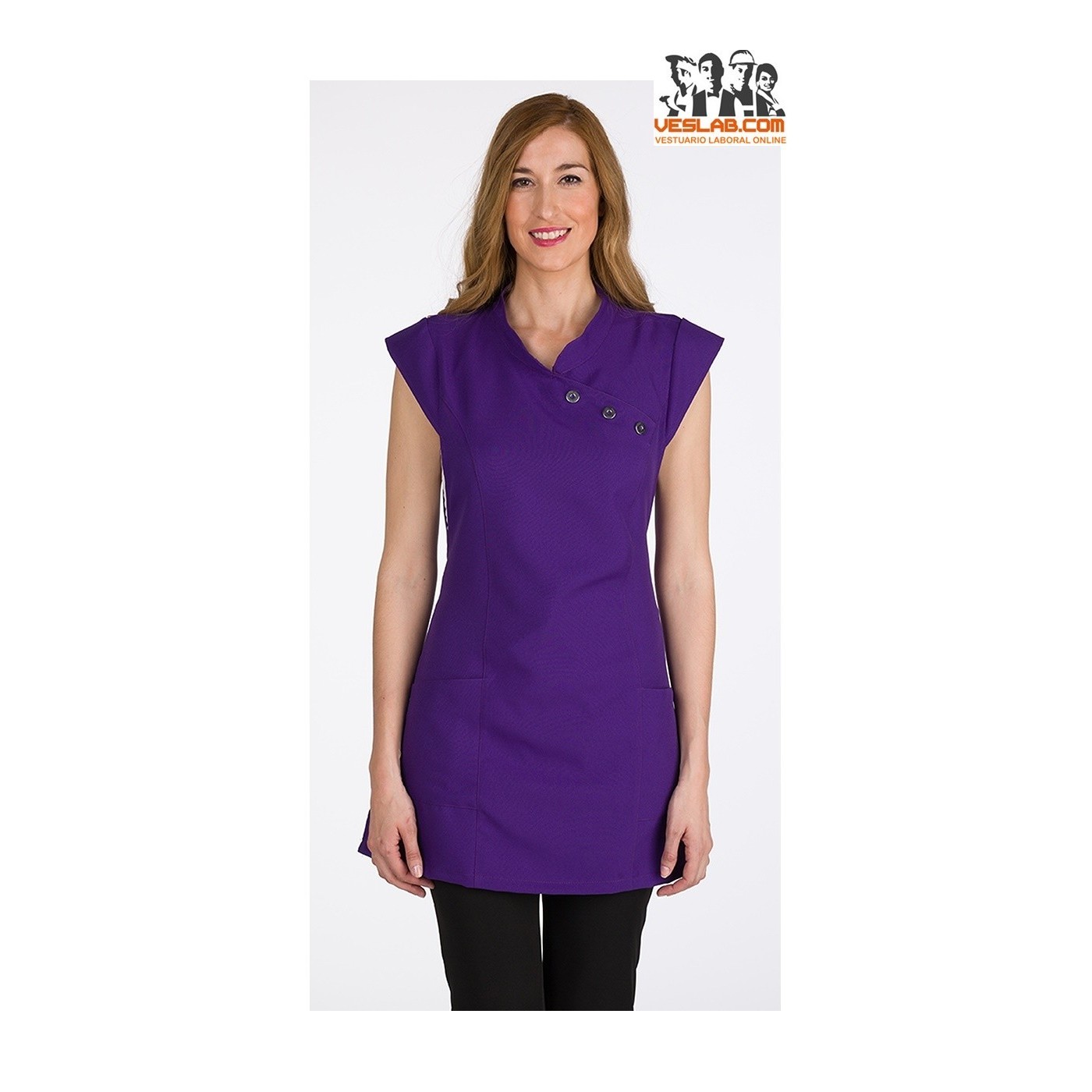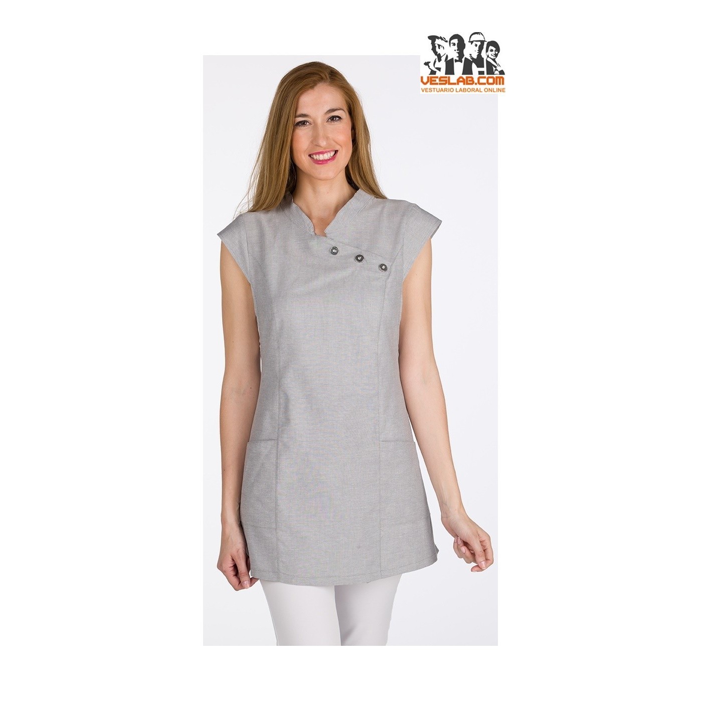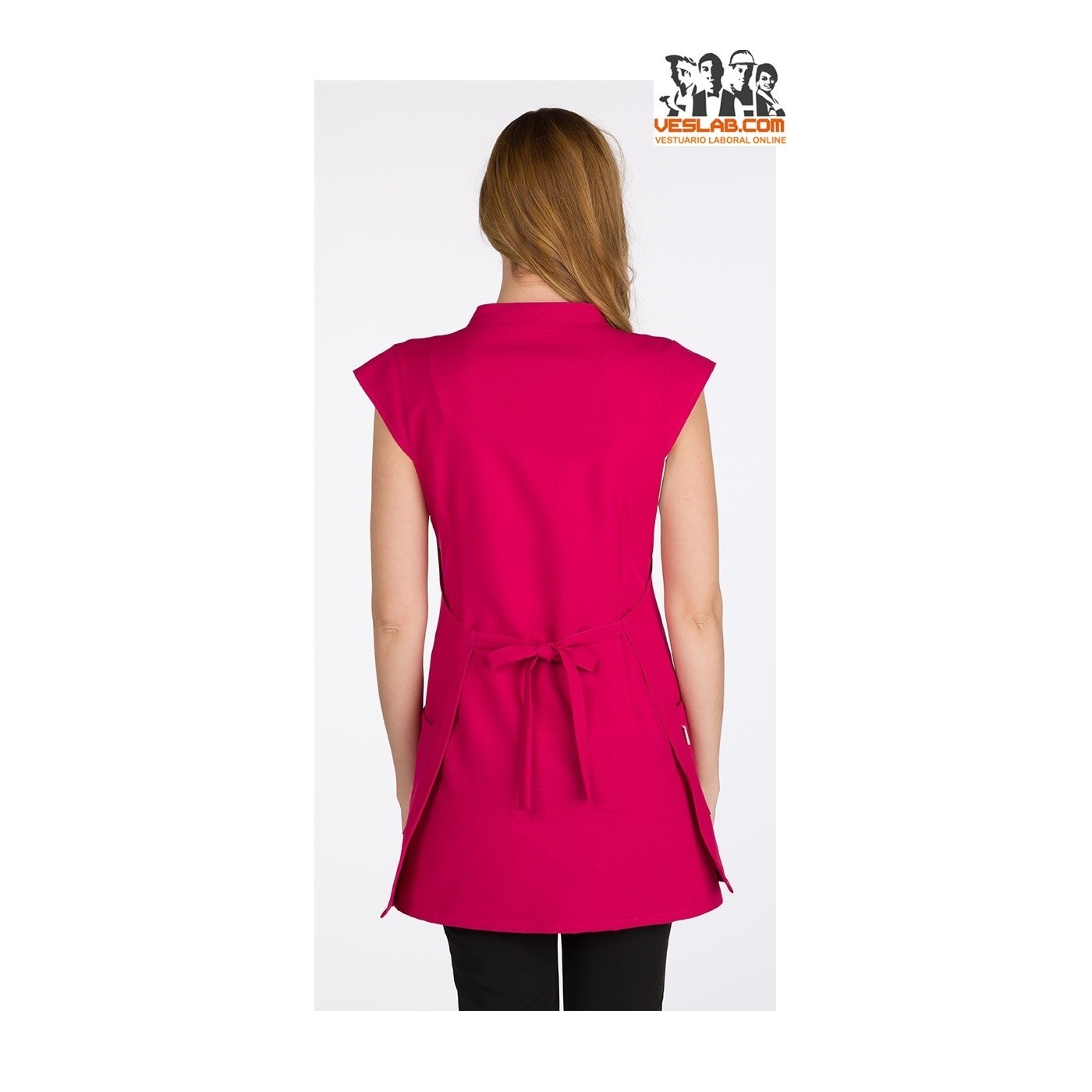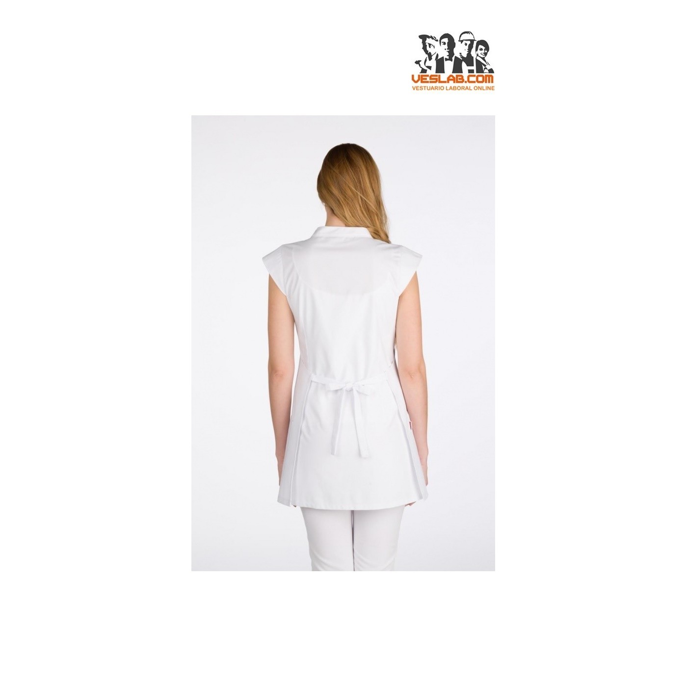 Estola coll mao, amb claudàtors metàl·lics a pressió, mini màniga, davant amb costadillos i butxaques, ajust cintura amb cintes que es creuen per l'esquena i es nuen a la cintura. COMPOSICIÓ: 100% POLIESTER / STREC