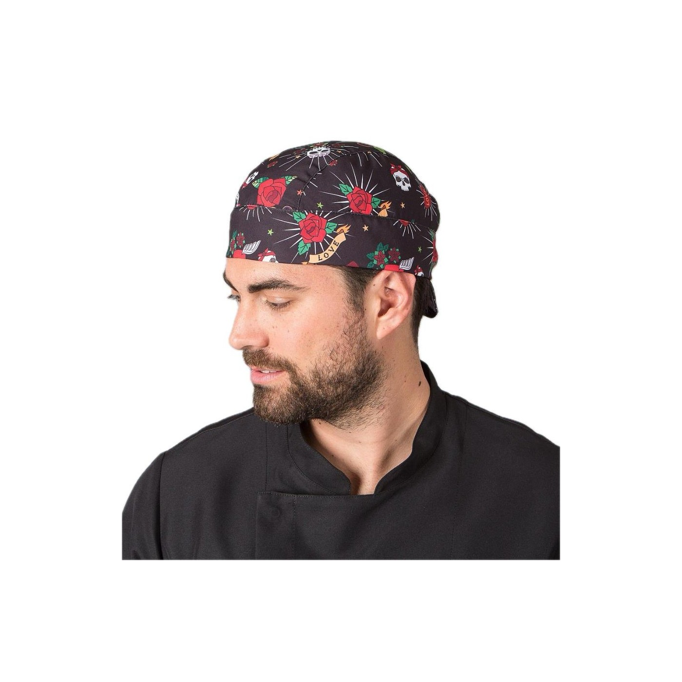 Barret unisex tipus bandana, confeccionat en teixit microfibra de 100% Polièster estampada amb un disseny original que compta amb altres complements a conjunt. Model disponible en talla única amb ajustament del darrere mitjançant tires per nuar. Ideal com a complement per a uniforme de xefs i cuiners o comerç d'alimentació.