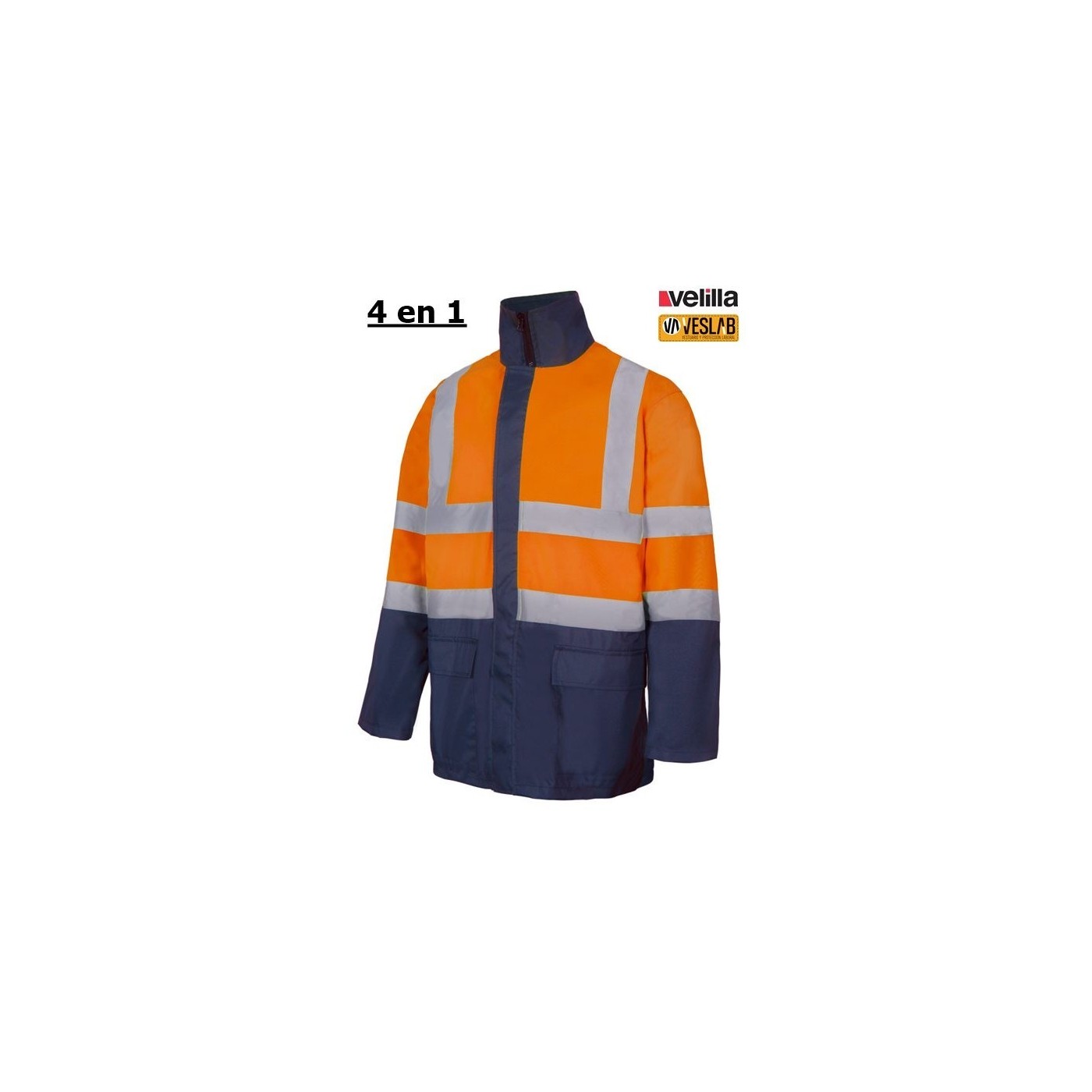 Quatre peces en una: Parka, Impermeable, Caçadora i Armilla Parca / Impermeable: Tancament central amb cremallera, culta amb tapeta. Tapeta central amb tancament de velcro. Cintes reflectants a tors, espatlles i mànigues.