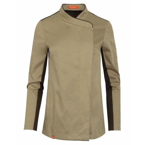 Jaqueta de cuina entallada per a dona de composició i talles molt còmoda, femenina i afavoridora. Botonadura oculta creuada i elegant coll mao. Elaborada amb teixit COOLMAX a l'esquena que millora la transpirabilitat i elasticitat de el moviment. Petita butxaca a la màniga izquieda.