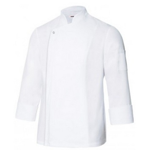 Jaqueta de cuiner amb coll mao i esquena amb teixit transpirable. Tancament asimètric amb