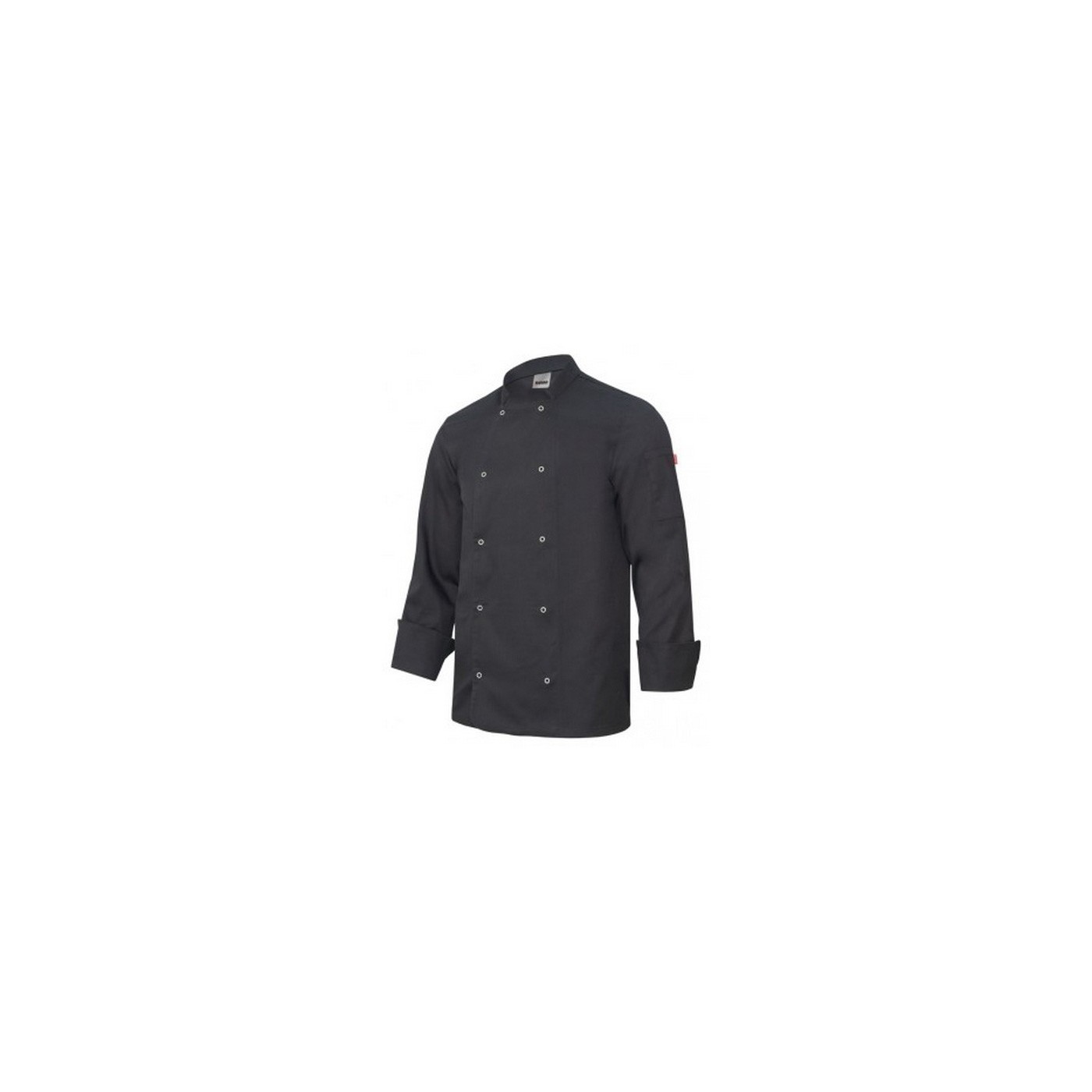 Jaqueta de cuiner de màniga llarga amb coll tireta . Doble botonada amb automàtics . Una butxaca de pegat a la màniga esquerra .