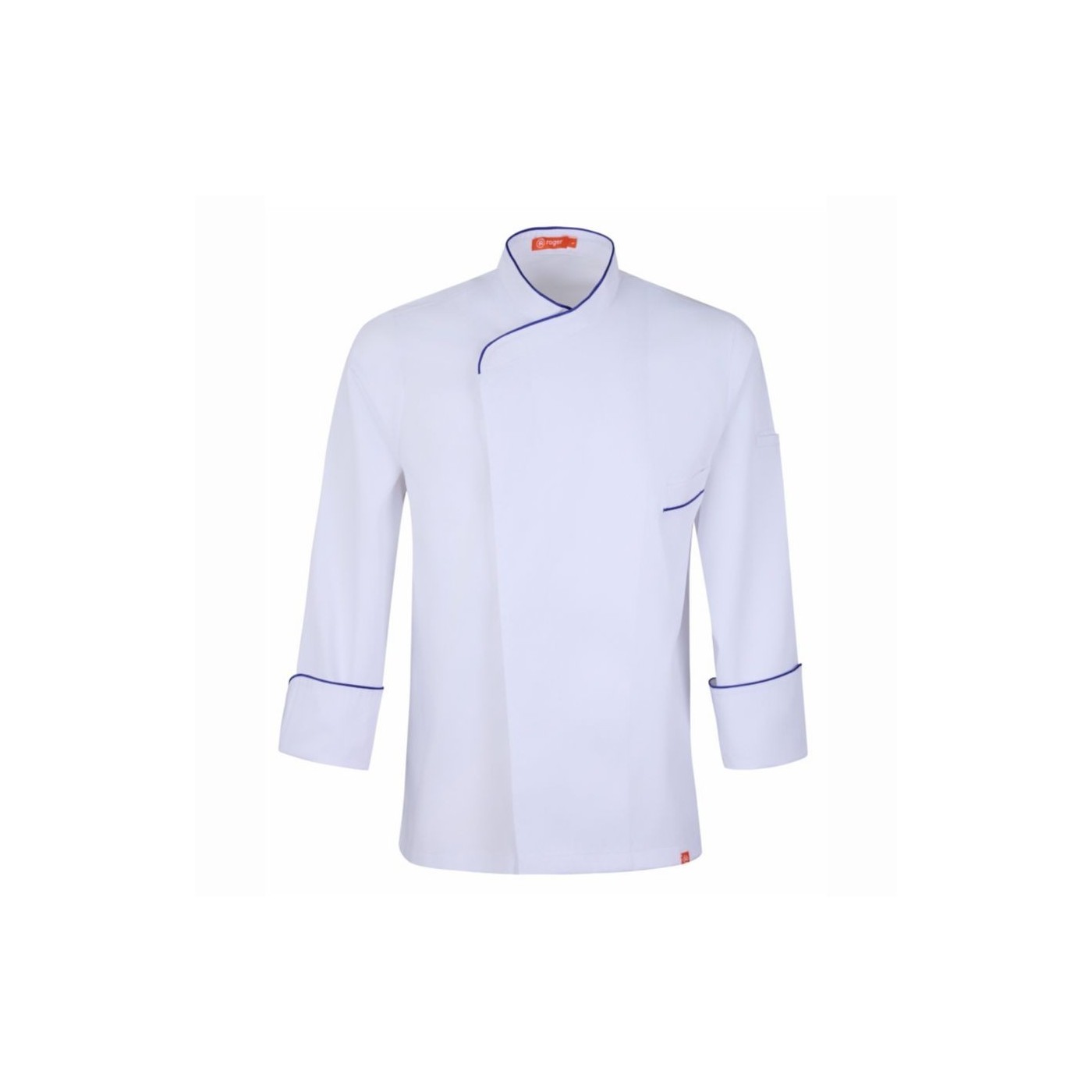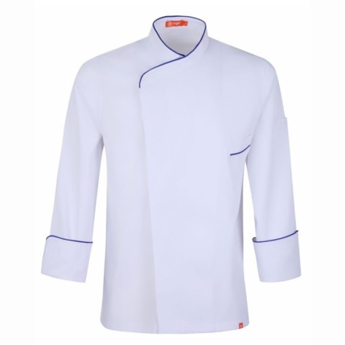 La Jaqueta de Cuina de Màniga Llarga MORELLA per a home ofereix un disseny elegant, tancament creuat amb botons ocults, rivets en contrast i teixit transpirable Coolmax a l’esquena per a màxim confort i funcionalitat.