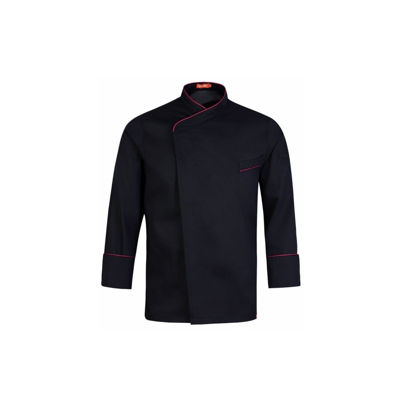 La Jaqueta de Cuina de Màniga Llarga MORELLA per a home ofereix un disseny elegant, tancament creuat amb botons ocults, rivets en contrast i teixit transpirable Coolmax a l’esquena per a màxim confort i funcionalitat.