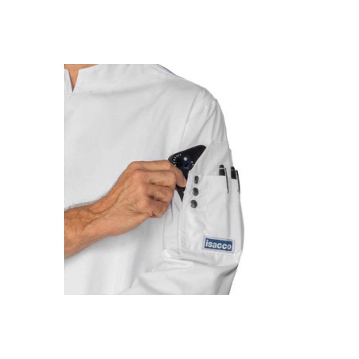 La Jaqueta Cuina Madrid per a home, en varis colors, combina 65% polièster i 35% cotó. Amb màniga curta, ventilació en aixelles, butxaca porta-mòbil i claudàtors ocults. Ideal per a xefs i professionals de la cuina.