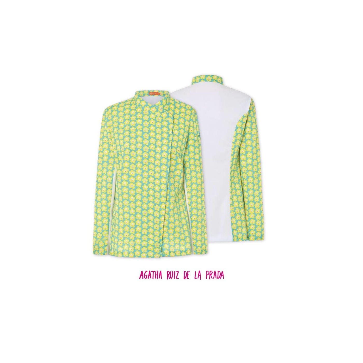 La jaqueta de cuina FLEUR per a dona combina el disseny exclusiu d'Agatha Ruiz de la Prada, teixit transpirable Coolmax i butxaca a la màniga.