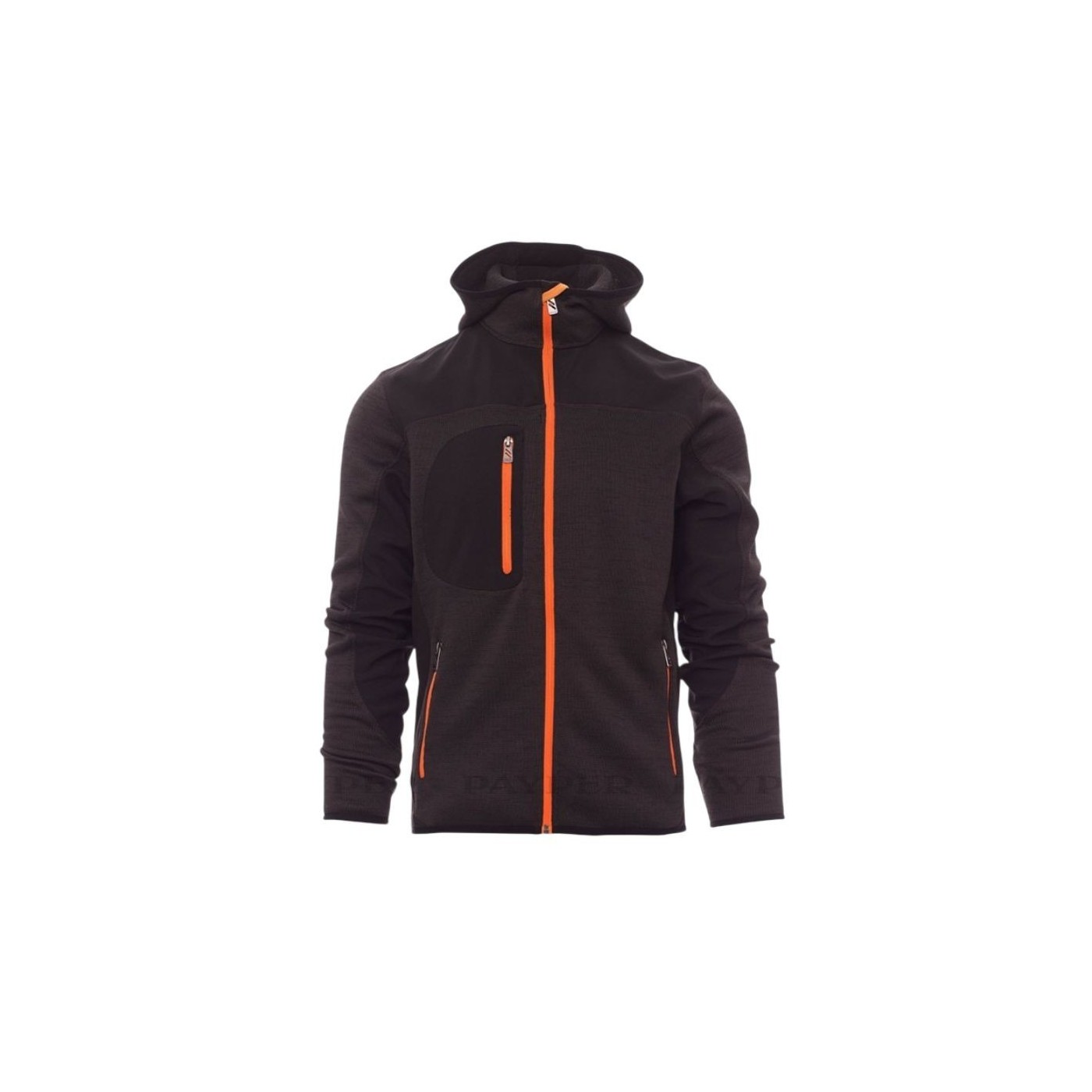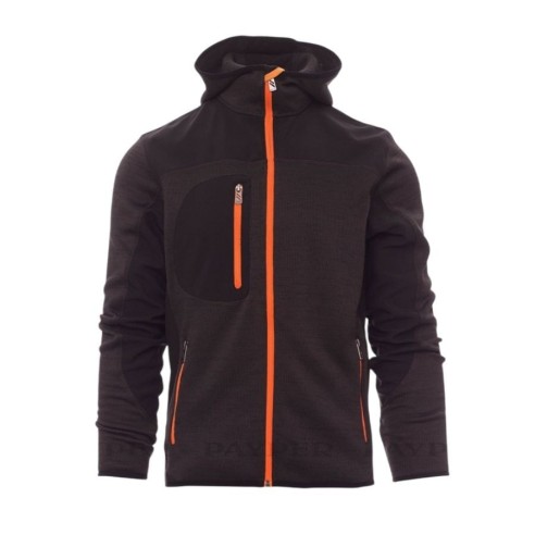 Disposa de caputxa amb doble costura, cremallera SBS, i butxaques laterals i al pit amb cremallera. El tall entallat i les insercions negres donen un toc elegant i professional.