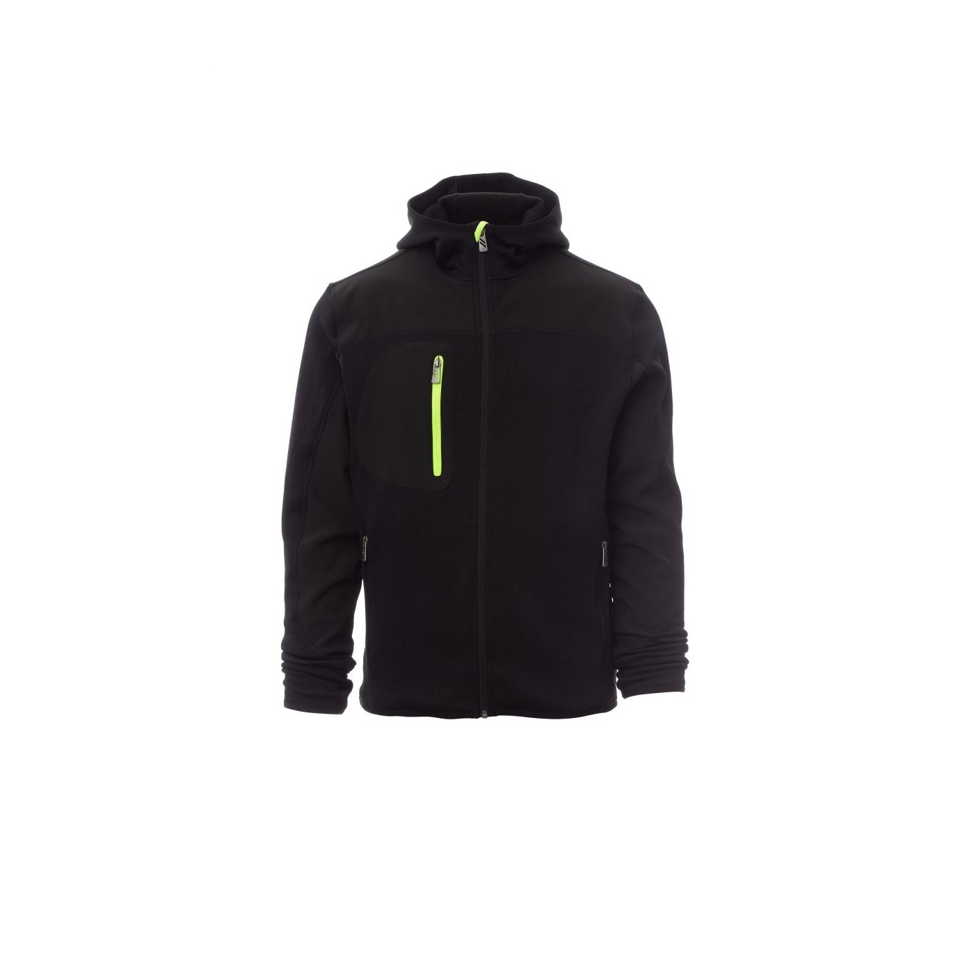 Disposa de caputxa amb doble costura, cremallera SBS, i butxaques laterals i al pit amb cremallera. El tall entallat i les insercions negres donen un toc elegant i professional.