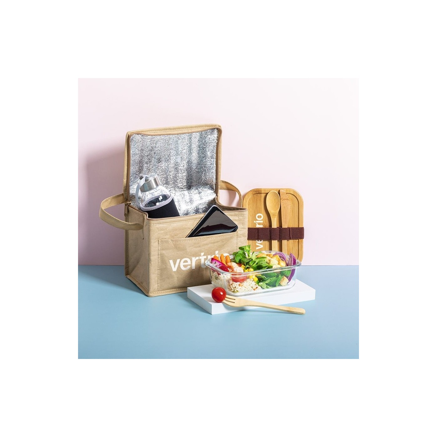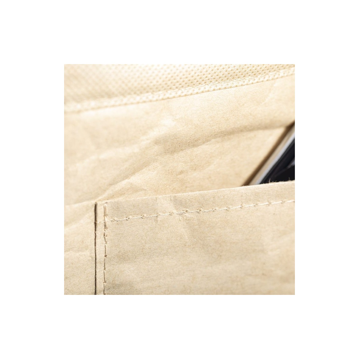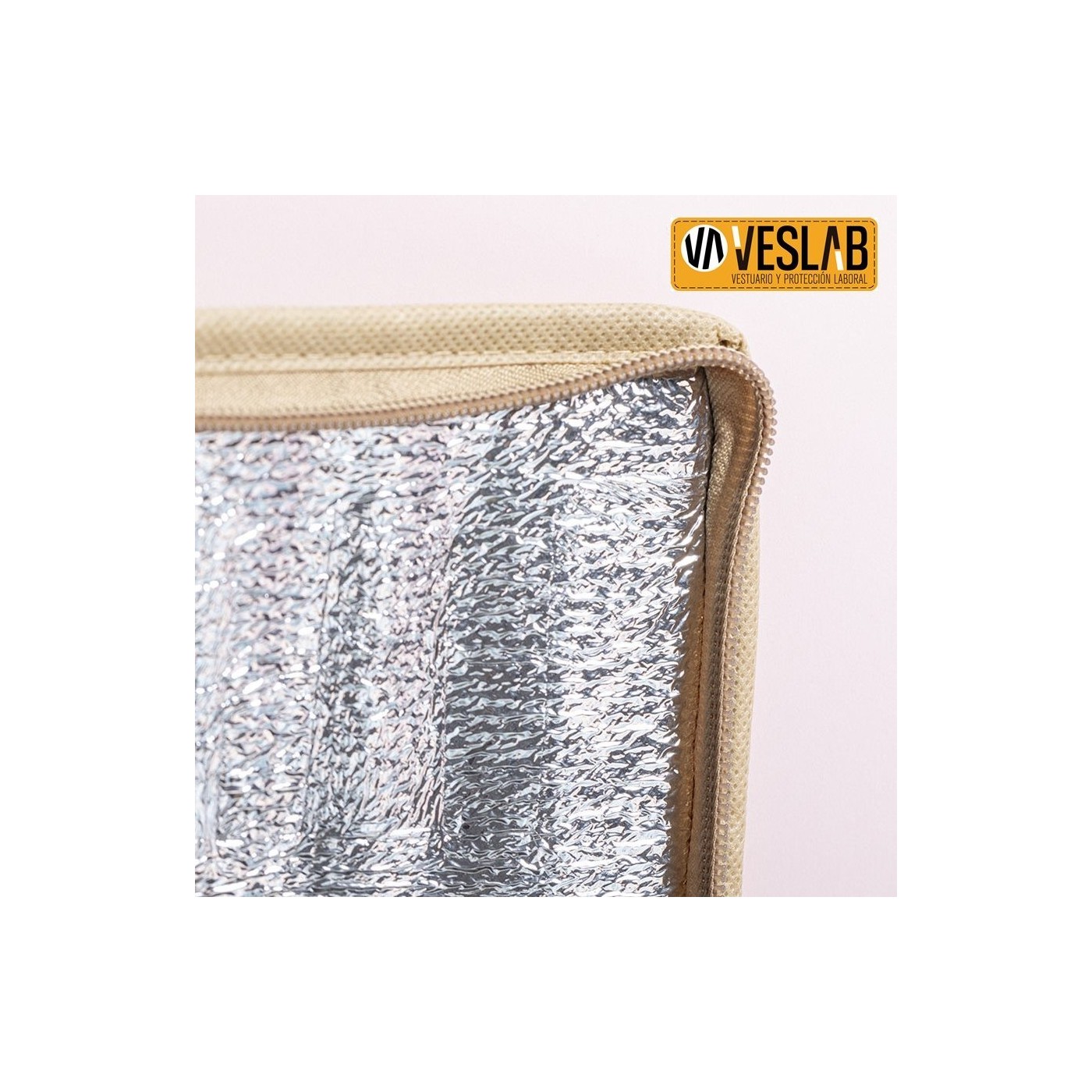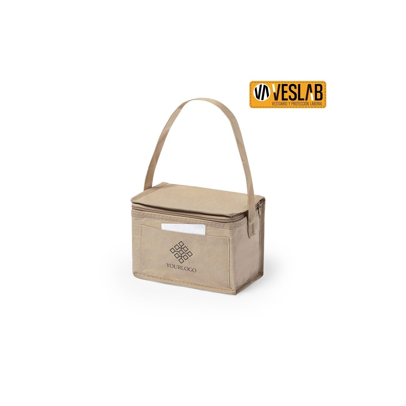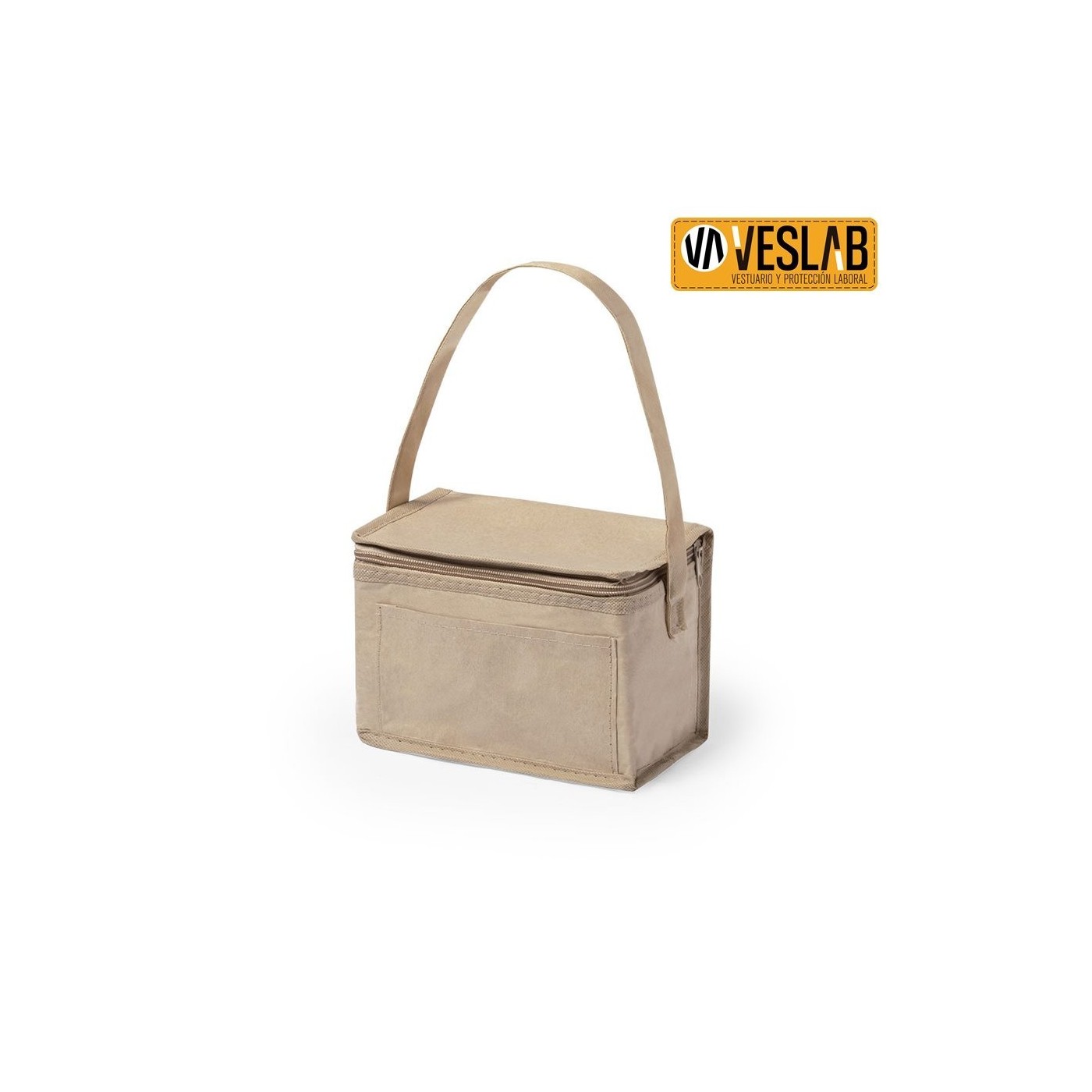 Nevera de línia nature amb capacitat per a 6 llaunes. Fabricada en paper laminat resistent a la humitat, amb interior isoterm acabat en alumini. Cremallera i nansa de transport a joc, amb butxaca exterior per marcatge.