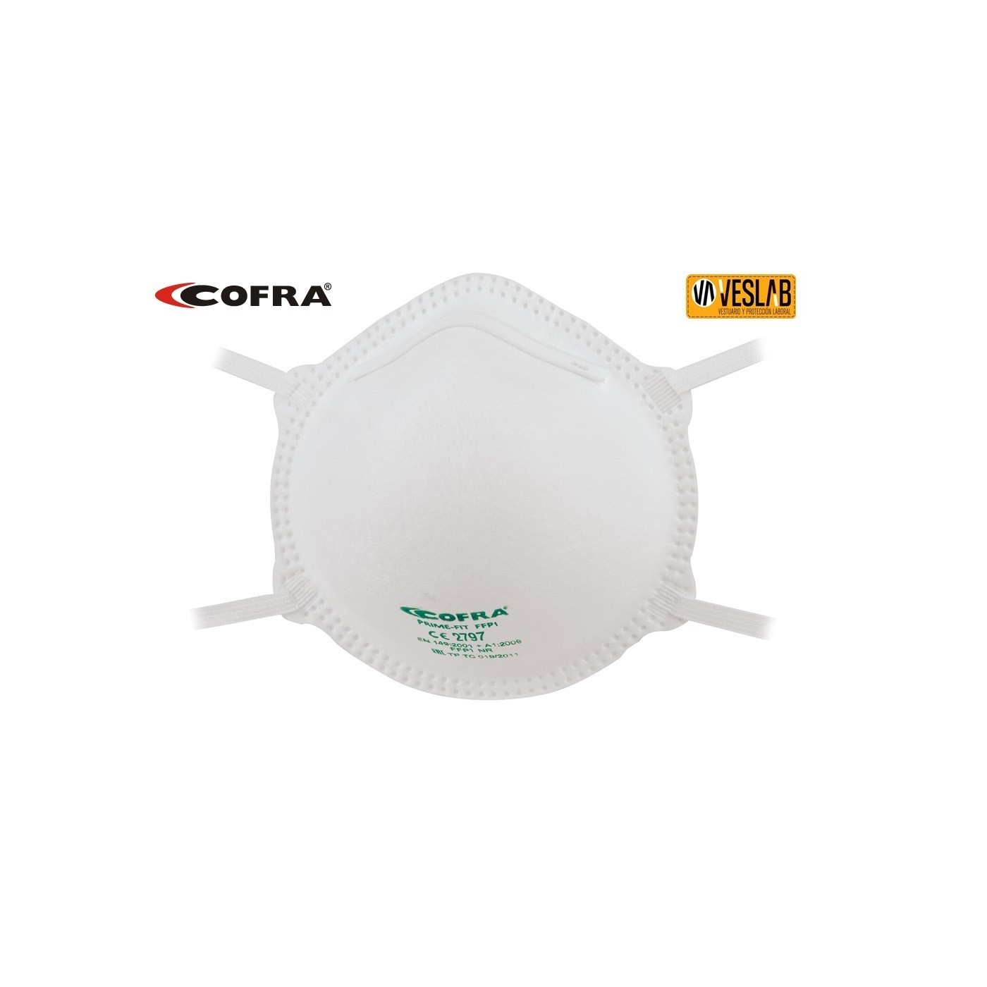 La màscara de protecció respiratòria PRIME-FIT FFP1 de Cofra ofereix un ajustament ergonòmic i comoditat per a ús diari. Amb una forma de petxina i sense parts metàl·liques exposades, proporciona protecció contra pols, fums i boires. Compleix la norma EN 149:2001+A1:2009 i està disponible en una talla única.
