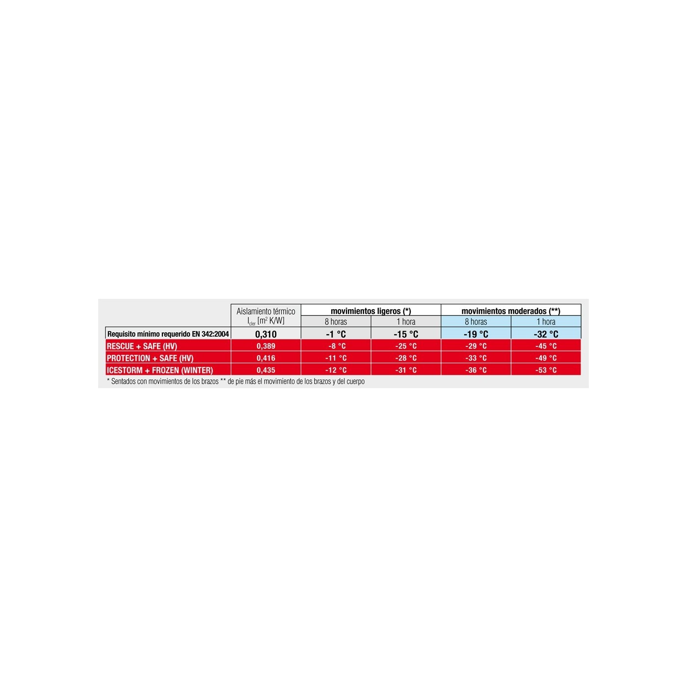 - Aïllament tèrmic: Certificat per a temperatures de fins a -8,4 °C (moviment lleuger) i -28,1 °C (moviment moderat).