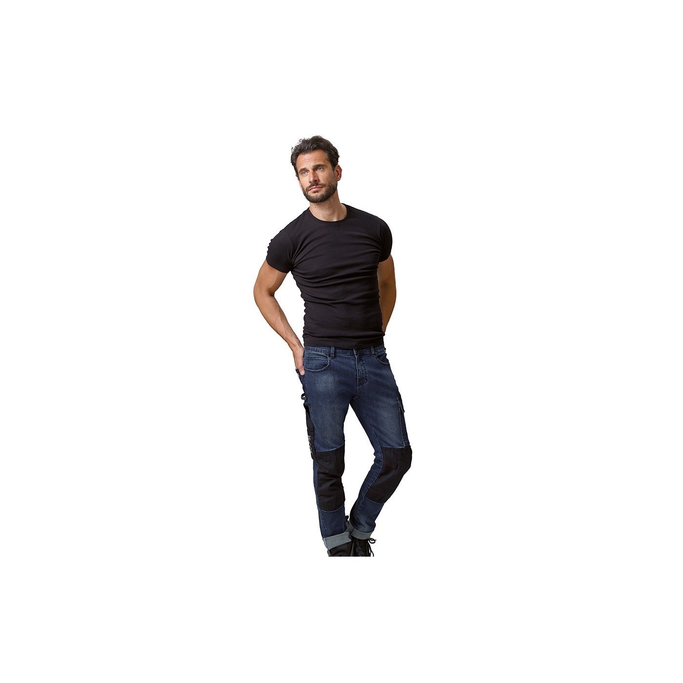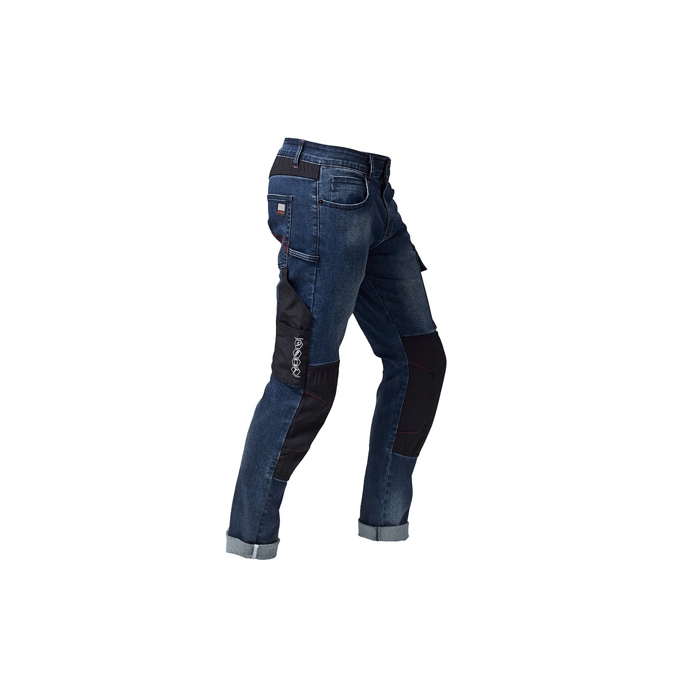 Aquests pantalons texans de treball presenta un disseny ajustat i elàstic amb insercions de teixit resistent al desgast. El tancament amb cremallera i botó garanteix un ajustament segur i còmode en tot moment. A més, compta amb un anell per a mosquetó, ideal per penjar eines o accessoris.