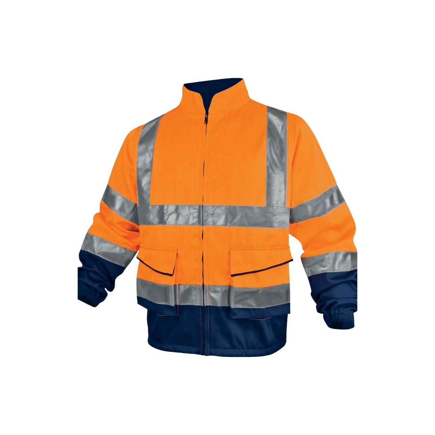 La jaqueta de treball d’alta visibilitat combina teixit 80% polièster i 20% cotó (230 g/m²), coll Mao, tancament amb cremallera i 2 butxaques. Certificada EN ISO 20471 Classe 2.