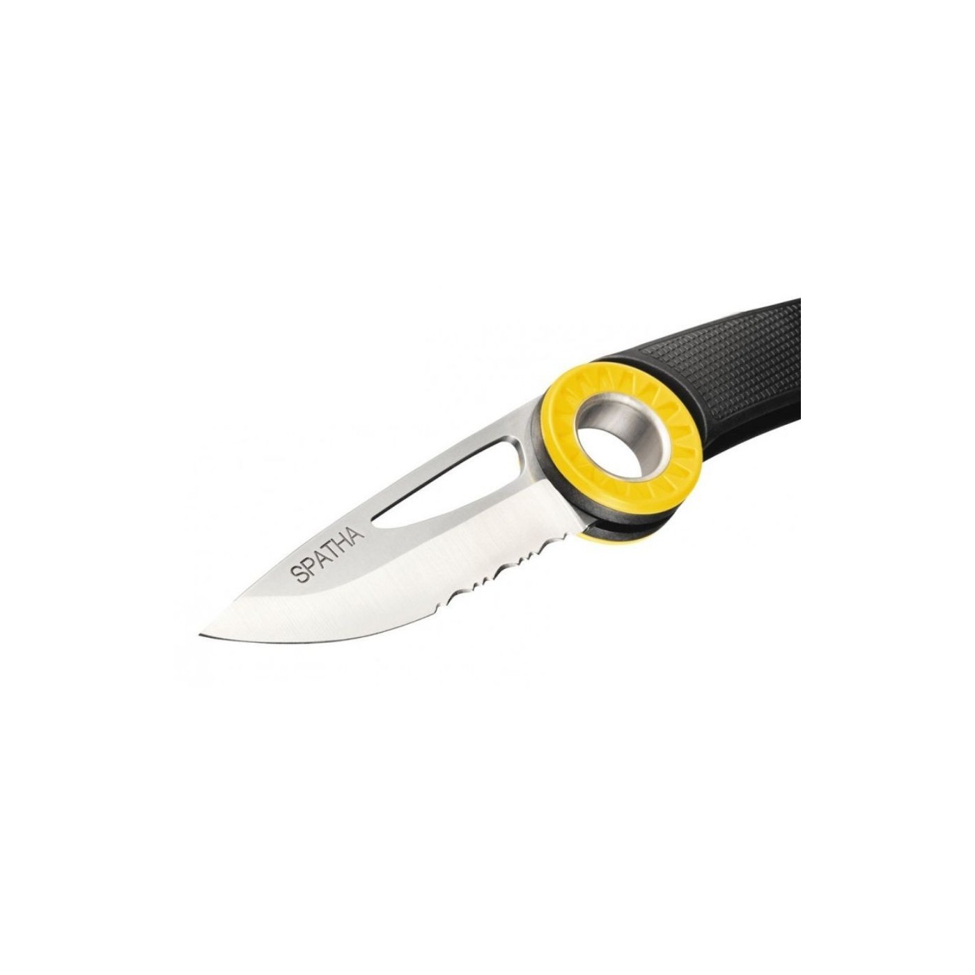 La navalla PETZL spatha és mosquetonejable, dissenyada per acompanyar el treballador en alçada durant el seu treball diari. El perfil del full permet tallar fàcilment cordes i cordinos. Disposa d'un orifici per passar un mosquetó i penjar amb facilitat la navalla d'l'arnès. Fàcil de manipular, fins i tot amb guants, gràcies a la roda dentada.