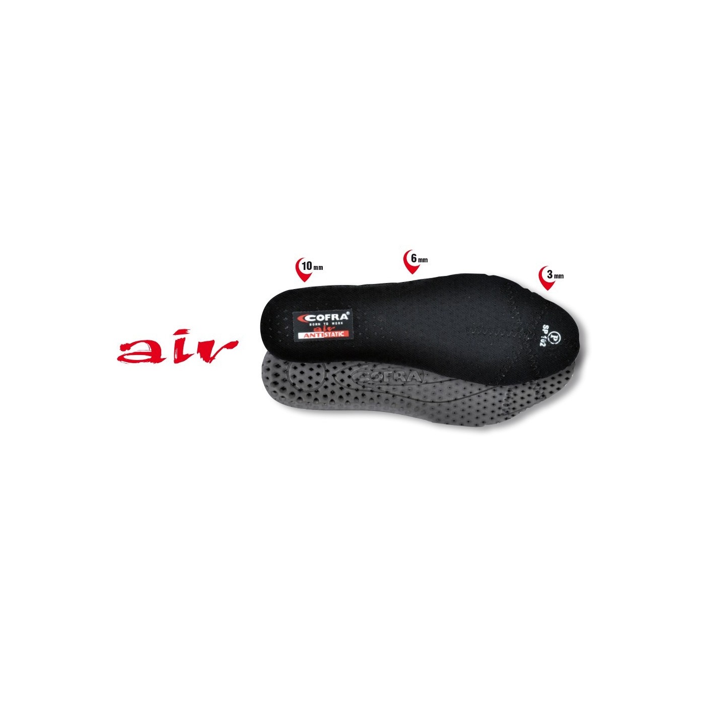 DESCRIPCIÓ: Plantilla anatòmica d'EVA i teixit, perforada. Antiestàtica gràcies a una triple costura realitzada amb fils conductius, garanteix un elevat suport gràcies a un correcte repartiment del seu gruix al llarg de la seva superfície