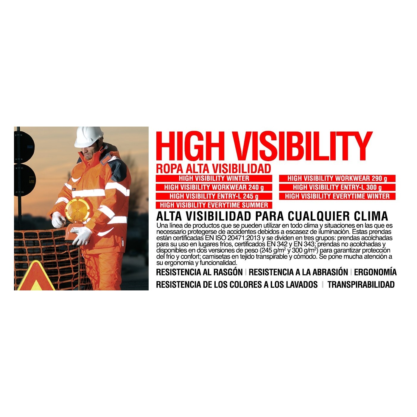 La línia de productes de Cofra HIGH VISIBILITY es poden utilitzar en qualsevol clima i situacione en les que es necessari protegir-se d'accidents degut a la poca il.luminació. Aquestes peces estan certificades EN 471/03 i es divideixen en tres grups: