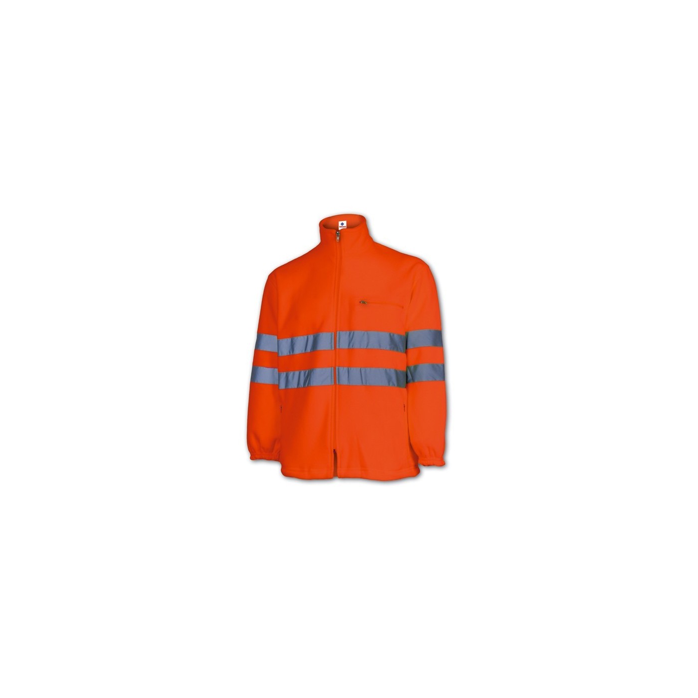 Jaqueta polar Alta Visibilitat amb tancament central per cremallera i cintes reflectants en tors i mànigues. Disposa de punys elàstics i ajustable amb stopper.