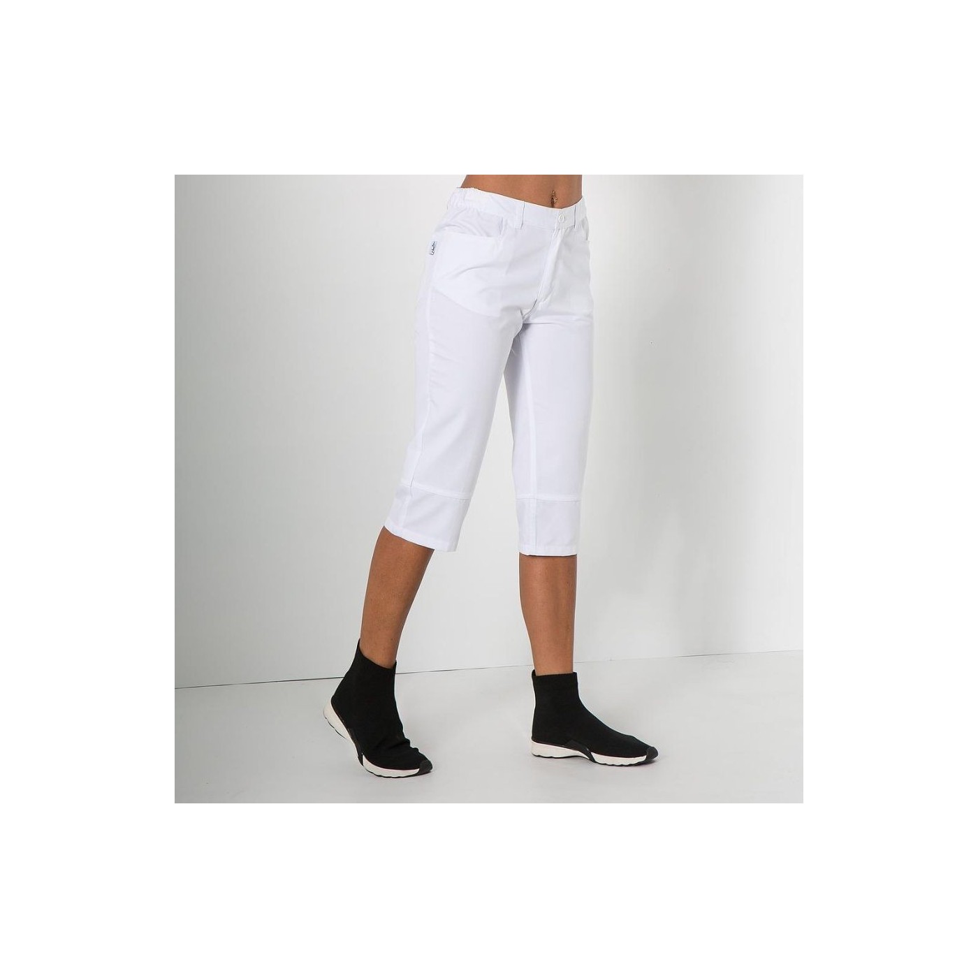 Pantalons pirata per a dona de cintura mitjana, amb cintura ajustable, teixit de sarja resistent i butxaques funcionals. Disponible en blanc o negre, combina estil, comoditat i practicitat per a l'entorn professional.