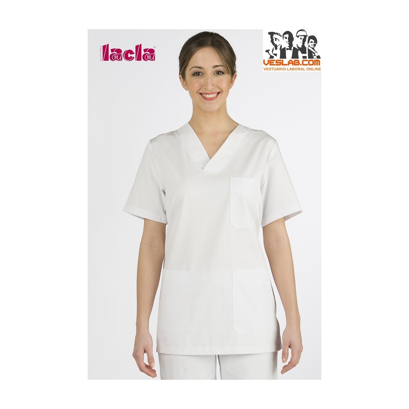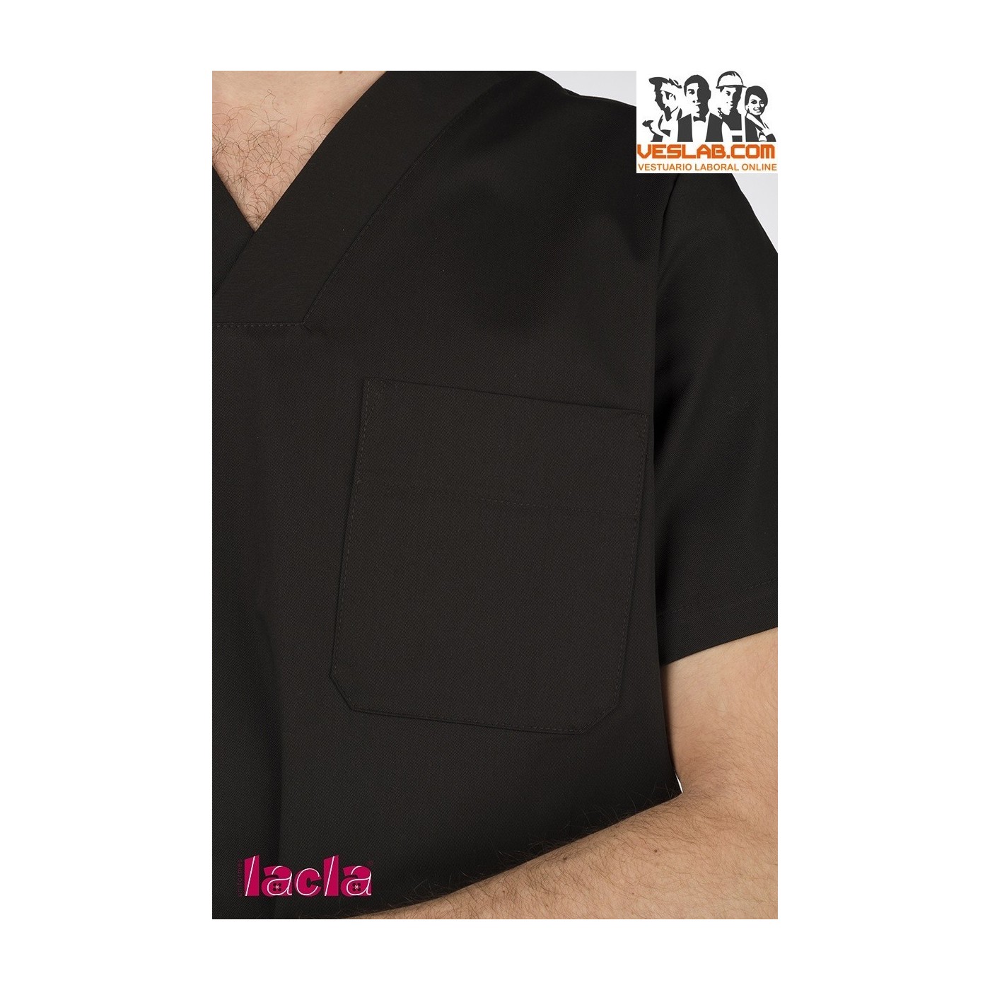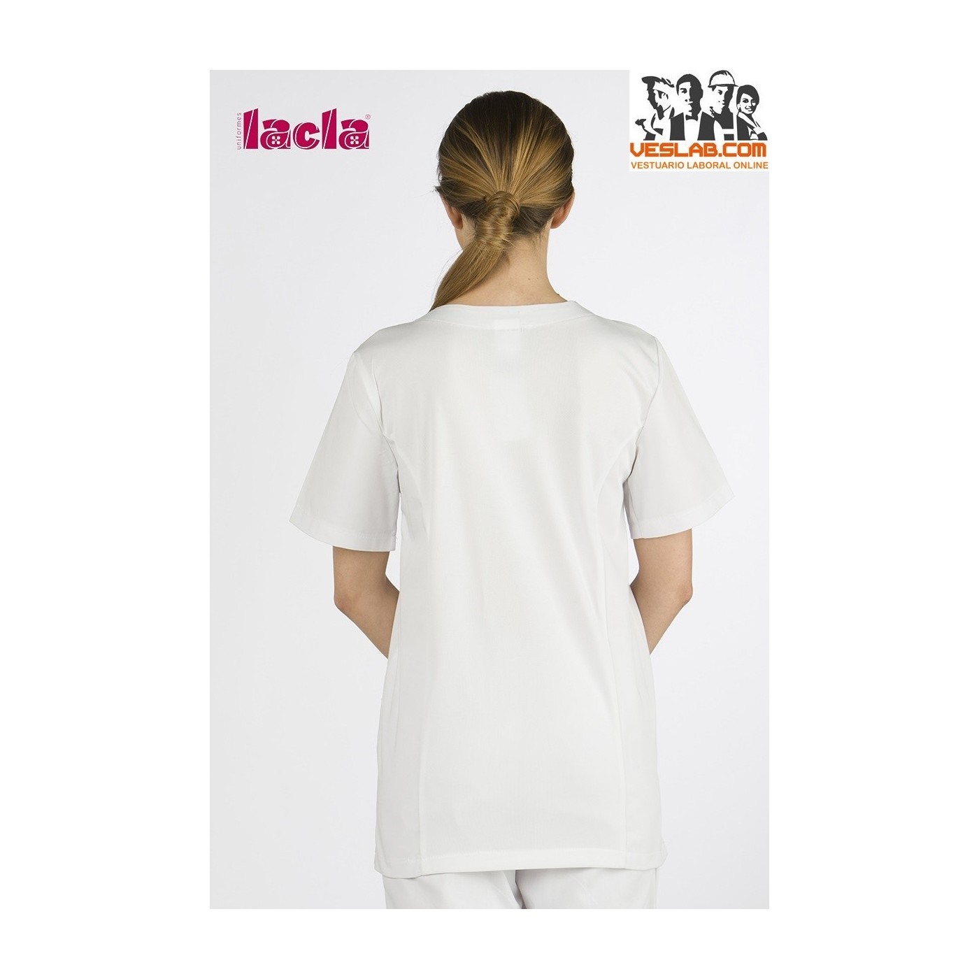Casaca llisa UNISEX, coll en punta, màniga curta, amb butxaques 1 de pit. Esquena central amb teixit elàstic i costadillos llisos.